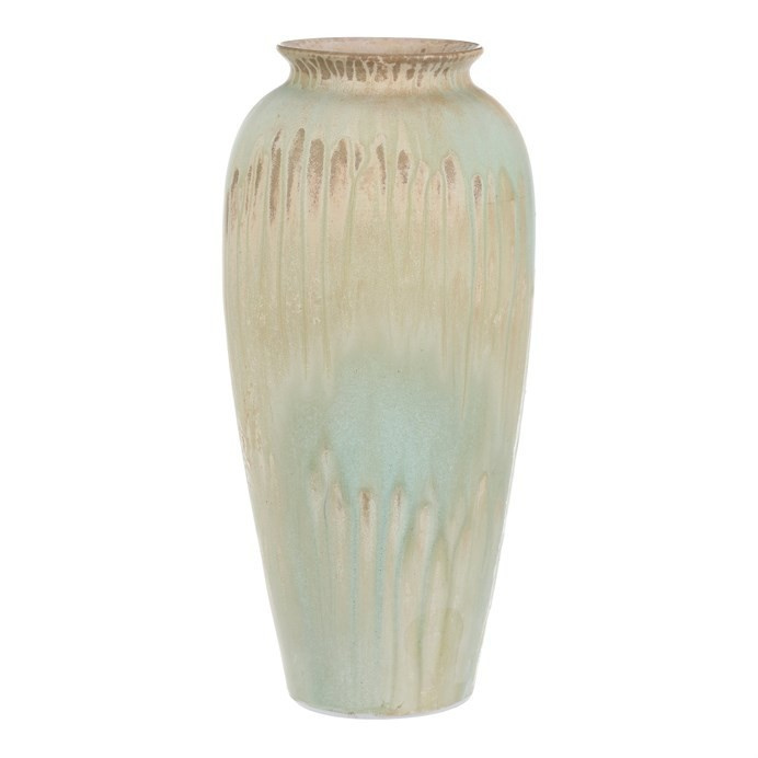 Keramická váza o výšce 40 cm ve tvaru amfory zaujme originálním mixem odstínů, kde se prolínají barvy od béžové přes světle hnědou až po zelenou. Její jedinečný design dodá prostoru nádech elegance a přírody, ať už ji využijete pro rostliny nebo jako samostatnou dekoraci doplněnou třeba ještě vhodnými přízdobami.