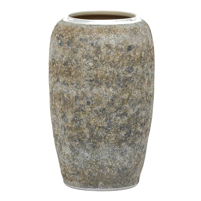 Keramická váza o výšce 70 cm v šedo-béžové kombinaci s výrazným zrnitým barevným povrchem přináší do interiéru nádech starověku. Střídání odstínů hnědé, béžové a šedé tvoří zajímavý efekt, zatímco mírně zaoblený tvar evokuje vzhled historické nádoby. Skvělá volba pro větší rostliny a květiny, které v ní krásně vyniknou.
