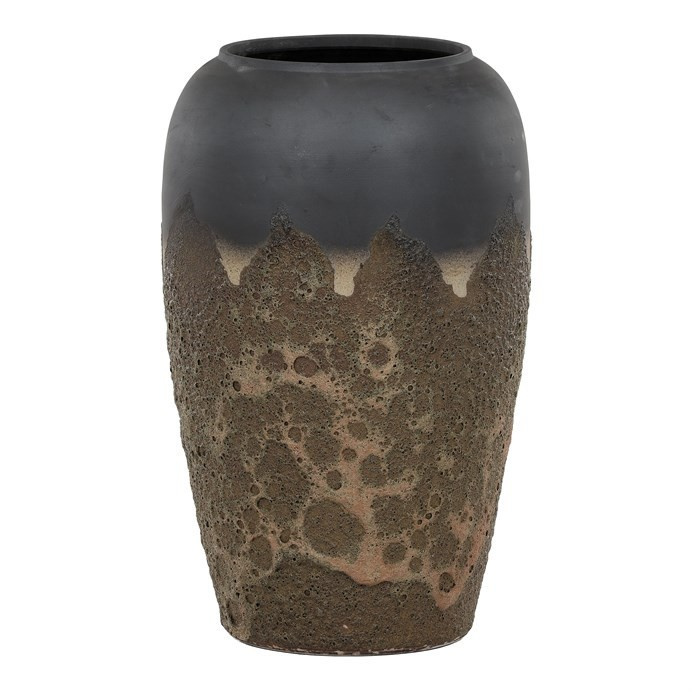 Keramická váza o výšce 70 cm zaujme kombinací šedo-hnědých tónů a kontrastních povrchů. Horní zaoblená část je hladká a šedá, zatímco spodní část v odstínech hnědé má hrubší texturu. Tento elegantní kus skvěle doplní jakýkoli interiér a je ideálním základem i pro větší a robustnější rostliny.