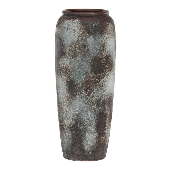 Keramická váza o výšce 90 cm v hnědo-šedém provedení s jemným prolínáním barev působí starodávně a elegantně. Její zaoblený tvar a zemitá paleta barev evokují historický charakter. Svými rozměry bude ideální volbou pro robustnější rostliny a květiny.