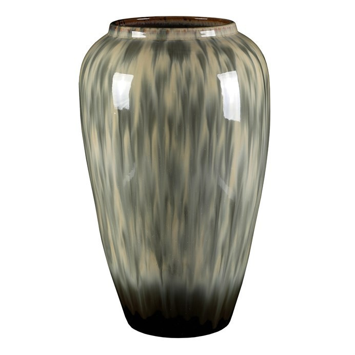 Keramická váza o výšce 40 cm zaujme zaobleným, vypouklým tvarem a lesklým povrchem s jemným žíháním v různých odstínech šedé. Svým designem připomíná antickou nádobu a zároveň evokuje dojem lesklého kamenného povrchu. Elegantní doplněk, který vynikne s rostlinami i jako samostatná dekorace.