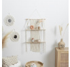 Polička Boho je kombinací bavlněné, pletené konstrukce s borovicovými policemi. Pletená polička ve stylu macramé se hodí do přírodního, světlého interiéru. Maximální zatížení: 5 kg