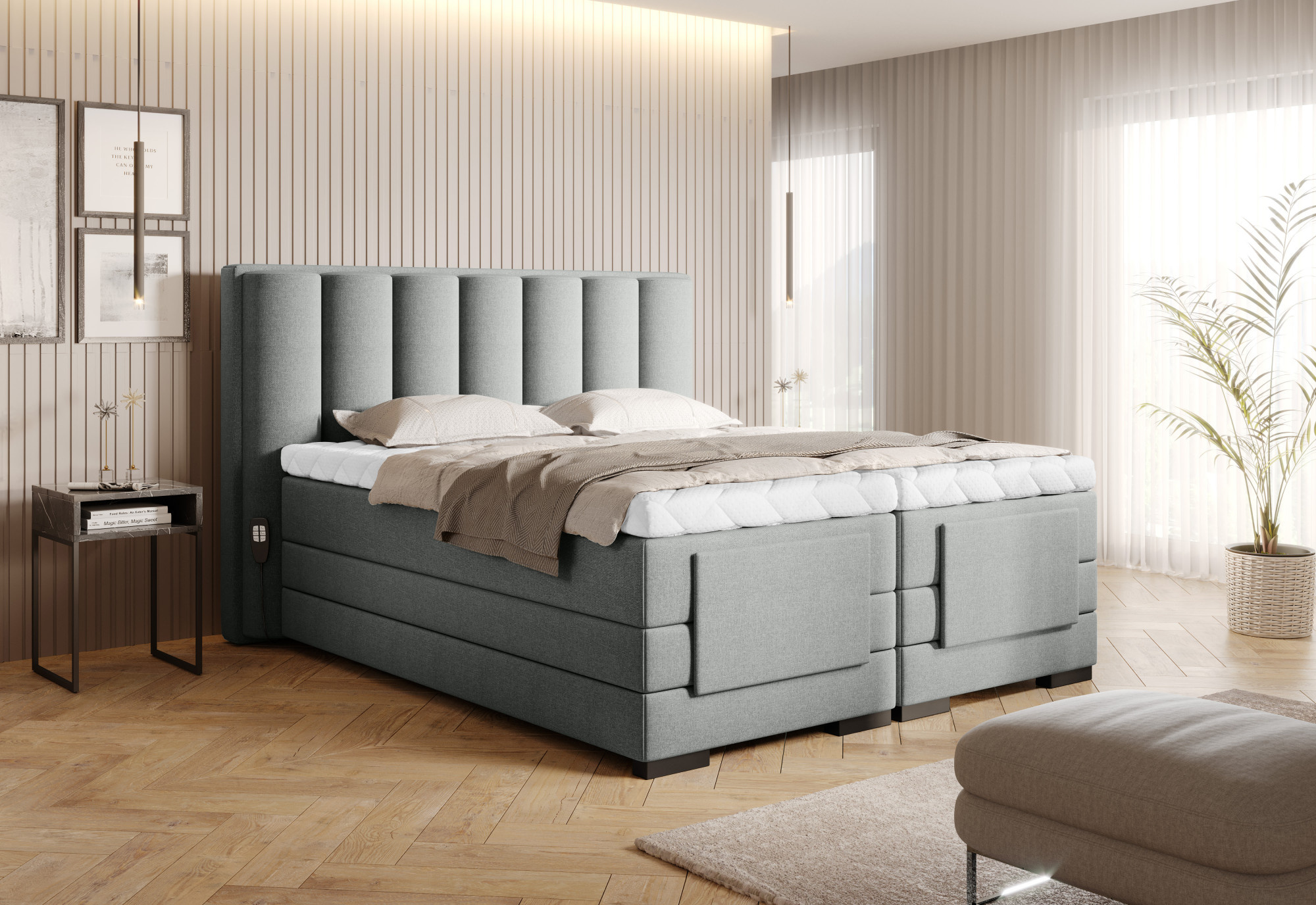 Nastavitelná elektrická postel Veros vám umožňuje ovládat pohodlí vašeho odpočinku, aby byl zajištěn pohodlný a klidný spánek. Má motorizovaný, nastavitelný rám, který uživateli umožňuje snadno nastavit části opěrky nohou a opěrky hlavy. Dokonce ani nemusíte vstávat z postele, abyste změnili její polohu, protože sada obsahuje dva dálkové ovladače. V případě jednolůžka je součástí jedno dálkové ovládání. Postel Veros se skládá až ze 2 hlavních matrací: bonellové a taštičkové, a vrchní matrace. Hlavní matrace poskytují maximální útulnost a pohodlí, které může kontinentální postel nabídnout. Chránič matrace naopak dokonale chrání hlavní matrace před nečistotami nebo poškozením. Výhody matracových topperů zahrnují také skutečnost, že poskytují dodatečnou měkkost a oporu během spánku a prodlužují životnost hlavní matrace. Matracový topper kontinentální postele Veros je zajištěn odnímatelným potahem z hedvábí, který lze prát v pračce. Elektrická postel Veros také vypadá fantasticky a je skvělým doplňkem každé ložnice. Čalouněné opěradlo umožňuje umístit tuto postel doprostřed místnosti, čímž se stane jejím středobodem. Černá barva nohou je univerzální a snadno zapadne do mnoha různých uspořádání ložnice. Další výhodou, která vám umožňuje vybrat si ideální postel Veros pro vaši ložnici, je skutečnost, že jsou k dispozici až ve 4 velikostech: 90/140/160/180 x 200 cm.