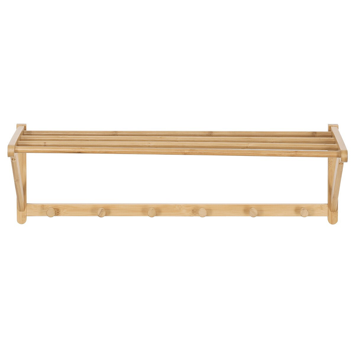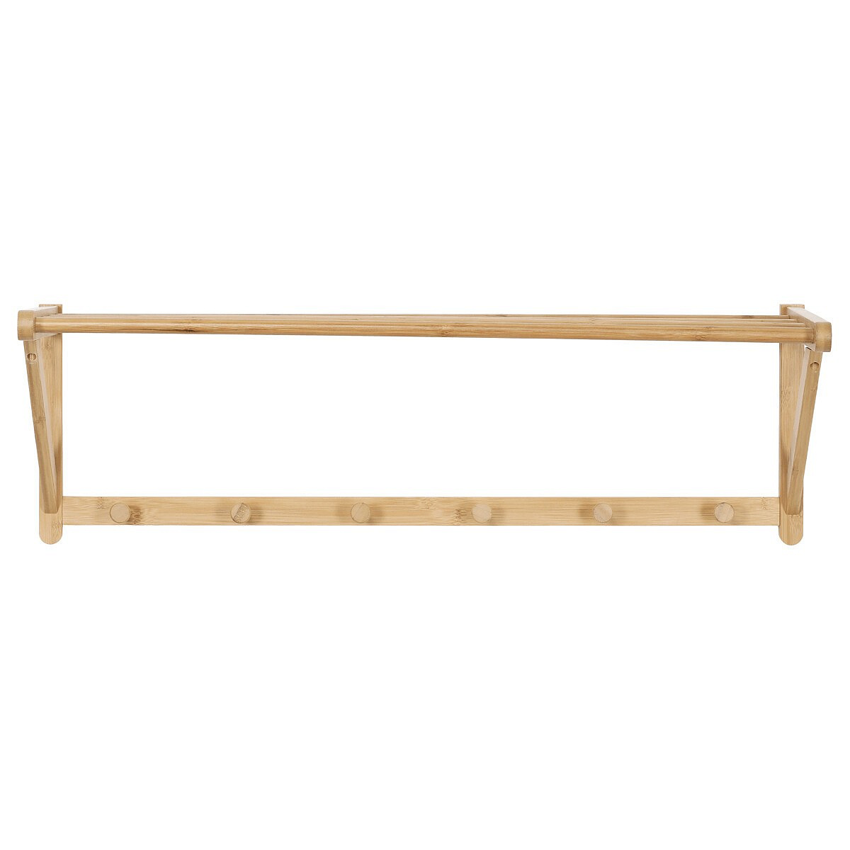 Nástěnná police s věšáky je vyrobena z masivního bambusu v přírodním odstínu, který přináší do interiéru příjemnou a teplou atmosféru. Police nabízí praktické horní místo pro odkládání drobných předmětů či dekorací, zatímco spodní část je vybavena šesti pevnými věšáky pro zavěšení kabátů, klobouků nebo tašek. Bambusové provedení se snadno udržuje a díky pevné montáži na stěnu zajišťuje stabilitu a dlouhou životnost. Design s hladce zaoblenými hranami a přírodní texturou materiálu podtrhuje jednoduchost a funkčnost produktu. Rozměry a nosnost odpovídají běžným požadavkům na domácí i kancelářské využití.