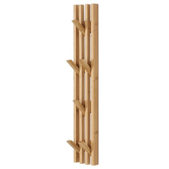 Nástěnný věšák z masivního bambusu v přírodním odstínu nabízí praktické a prostorově úsporné řešení pro zavěšení oděvů či doplňků. Skládací design umožňuje snadné rozložení a opětovné složení podle potřeby, což šetří místo v interiéru. Věšák je tvořen čtyřmi vertikálními lištami s pevně připevněnými háčky, které jsou rozmístěny ve třech úrovních pro pohodlné zavěšení různých předmětů. Bambusové provedení zajišťuje pevnost a stabilitu, zároveň materiál snadno udržuje přirozený vzhled a je odolný vůči běžnému opotřebení. Kompaktní rozměry a jednoduchý montážní systém umožňují jeho využití v předsíních, koupelnách nebo kancelářích.