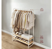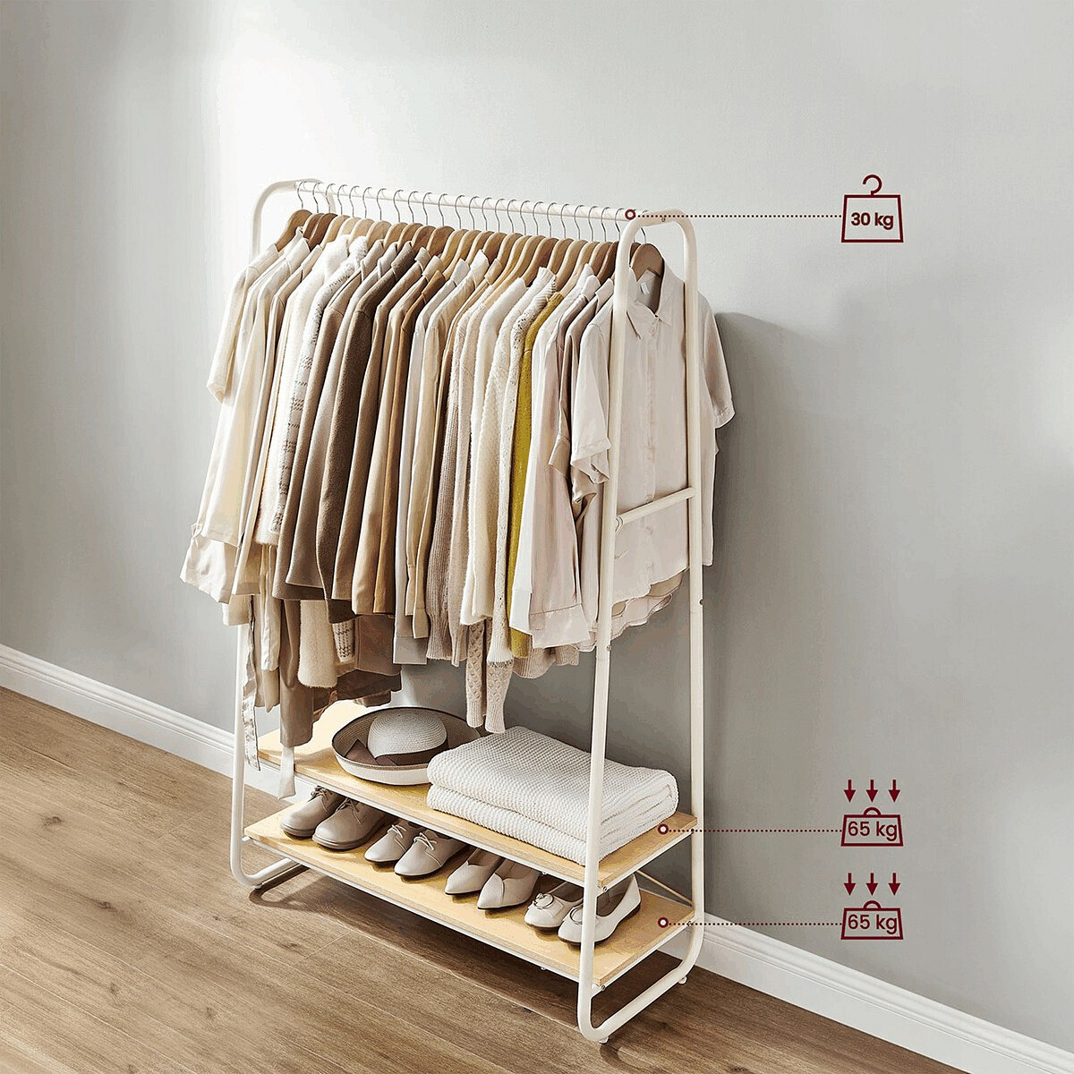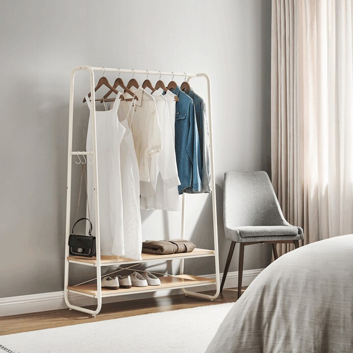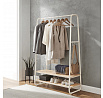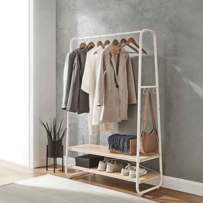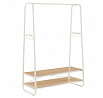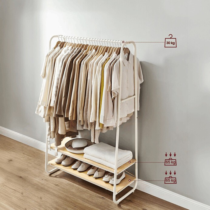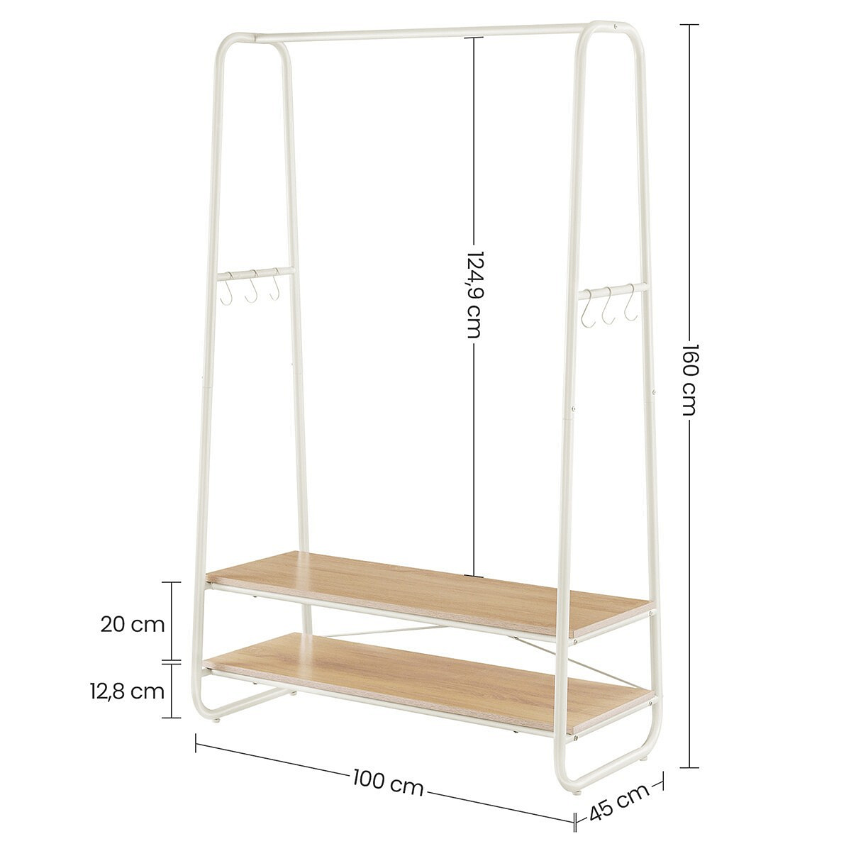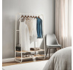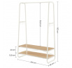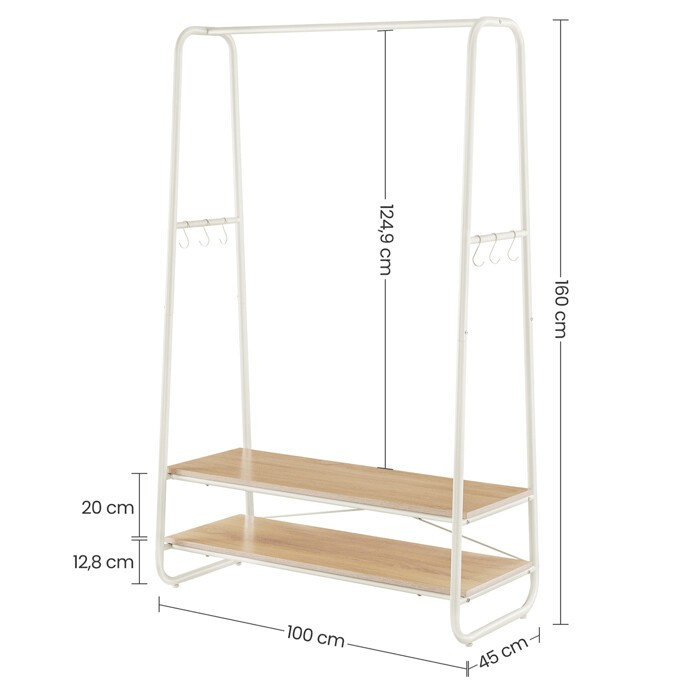 Věšák s dvěma policemi v bílém provedení kombinuje pevnou kovovou konstrukci s praktickými policemi z MDF s dubovým dekorem, které poskytují dostatek úložného prostoru pro obuv nebo doplňky. Stabilní rám je navržen v nadčasovém designu s oblými hranami, což zajišťuje bezpečné a pohodlné používání. Horní část věšáku nabízí dostatečnou délku pro zavěšení oděvů na ramínka, zatímco po stranách jsou umístěny kovové háčky pro zavěšení menších předmětů. Povrchová úprava kovu je hladká a snadno udržovatelná, což přispívá k dlouhé životnosti produktu. Rozměry a nosnost odpovídají běžným požadavkům na domácí i komerční použití.