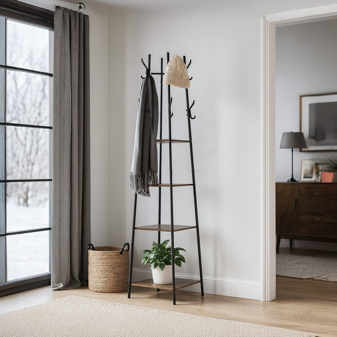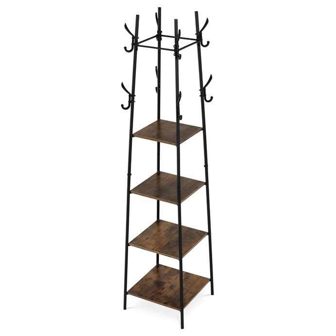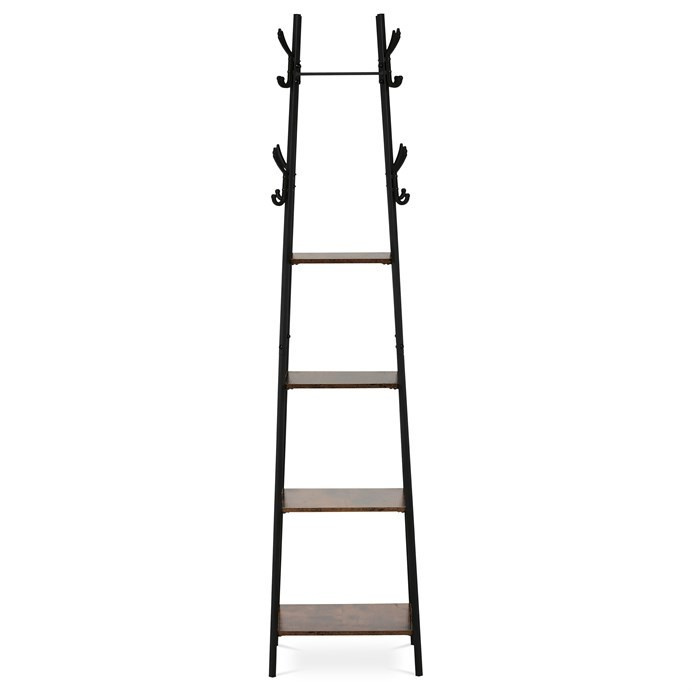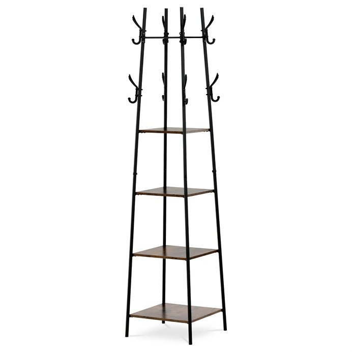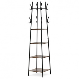 Věšák značky Autronic s praktickými policemi a industriálním designem je ideálním řešením pro organizaci a dekoraci vaší předsíně nebo ložnice. Kombinace dekoru starého dřeva a černého kovového rámu dodává interiéru moderní charakter. Čtyři prostorné police nabízí dostatek místa pro odkládání doplňků, klobouků nebo bot, zatímco háčky umožňují zavěšení kabátů a tašek. Tento multifunkční kousek spojuje styl a praktičnost, což ocení každý, kdo hledá designový a účelný doplněk pro svůj domov.