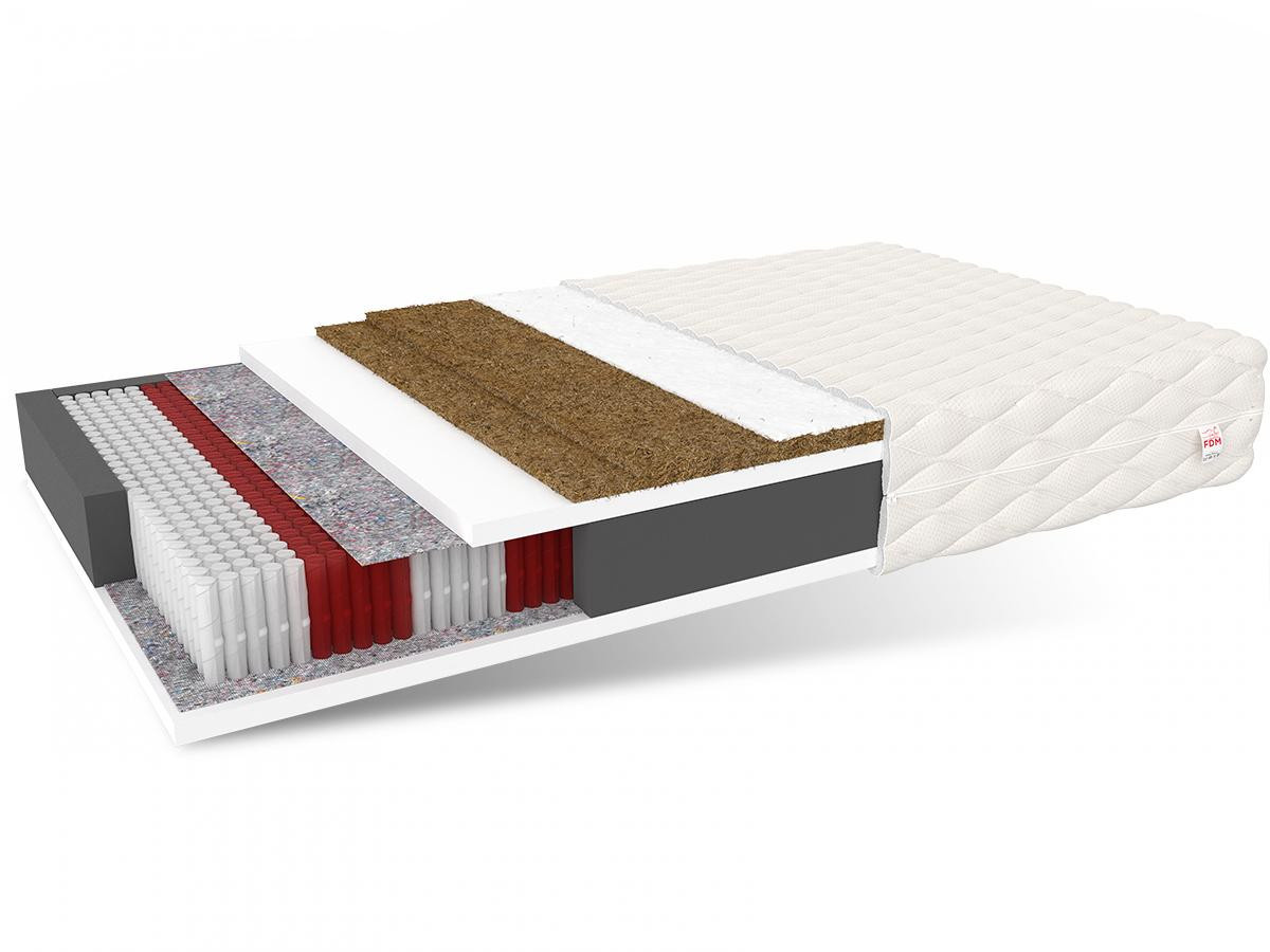 Matrace GRADO má taštičkové pružiny typu multipocket, které ji rozdělují do 7 zón tvrdosti. Pružin s více kapsami je více než ve standardních kapsových formátech. Fungují nezávisle na sobě, takže dva spící lidé nepociťují žádné nepohodlí způsobené pohyby toho druhého. Pružiny se vyznačují vysokou odolností proti deformaci a promáčknutí. Jsou vyrobeny technologií podvodního kalení NanoHARD, která výrazně zvyšuje jejich životnost. U tohoto modelu je použita dvojitá kokosová vložka, která dodatečně zpevňuje povrch matrace. Zlepšuje také cirkulaci vzduchu, čímž zabraňuje nadměrnému pocení. Specifikace: tvrdost: H4 tvrdá; H5 velmi tvrdá, tloušťka: 19 cm. Složení: kokosová vložka: 2x1 cm, klimatizační vlákno: 1 ks., Polyuretanová pěna T25: 2 cm, Potah: 1 cm, Výška pružiny: 12 cm, Polyuretanová pěna T25: 2 cm.