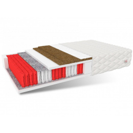 Matrace GRADO MAX má taštičkové pružiny typu multipocket, které ji rozdělují do 7 zón tvrdosti. Pružin s více kapsami je více než ve standardních kapsových formátech. Fungují nezávisle na sobě, takže dva spící lidé nepociťují žádné nepohodlí způsobené pohyby toho druhého. Pružiny se vyznačují vysokou odolností proti deformaci a promáčknutí. Jsou vyrobeny technologií podvodního kalení NanoHARD, která výrazně zvyšuje jejich životnost. U tohoto modelu je použita dvojitá kokosová vložka, která dodatečně zpevňuje povrch matrace. Zlepšuje také cirkulaci vzduchu, čímž zabraňuje nadměrnému pocení. Specifikace: tvrdost: H4 tvrdá; H5 velmi tvrdá, tloušťka: 25 cm. Složení: kokosová vložka: 2x1 cm, klimatizační vlákno: 1 ks., Polyuretanová pěna T25: 2 cm, Potah: 1 cm, Výška pružiny: 18 cm, Polyuretanová pěna T25: 2 cm.