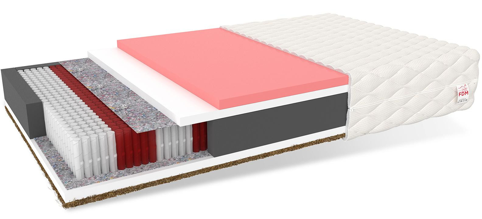 Matrace IVREA MAX má vícepolohovou základnu, která je rozdělena do 7 zón tvrdosti. Pružin s více kapsami je více než ve standardních kapsových formátech. Fungují nezávisle na sobě, takže dva spící lidé nepociťují žádné nepohodlí způsobené pohyby toho druhého. Pružiny se vyznačují vysokou odolností proti deformaci a promáčknutí. Jsou vyrobeny technologií NanoHARD, která výrazně zvyšuje jejich životnost. Matrace má 4cm vložku z termoplastické pěny VISCO s funkcí tělové paměti. Díky své speciální struktuře reaguje na teplotu a tlak a kopíruje tvar člověka, který na něm spí. Na druhé straně je použita odolná kokosová vložka, která má protiplísňové vlastnosti. Společnost IVREA je držitelem Zlaté medaile MTP 2020 za prokázanou kvalitu. Zveme vás k přečtení krátké reportáže z veletrhu. Specifikace: tvrdost: H3 středně tvrdá; H5 velmi tvrdá, tloušťka: 28 cm. Složení: polyuretanová pěna T25: 2 cm, termoplastická pěna VISCO: 4 cm, potah: 1 cm, výška pružiny: 18 cm, polyuretanová pěna T25: 2 cm, kokosová vložka: 1 cm.