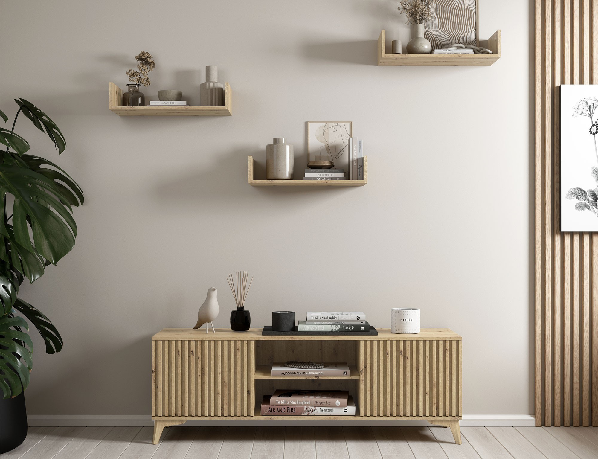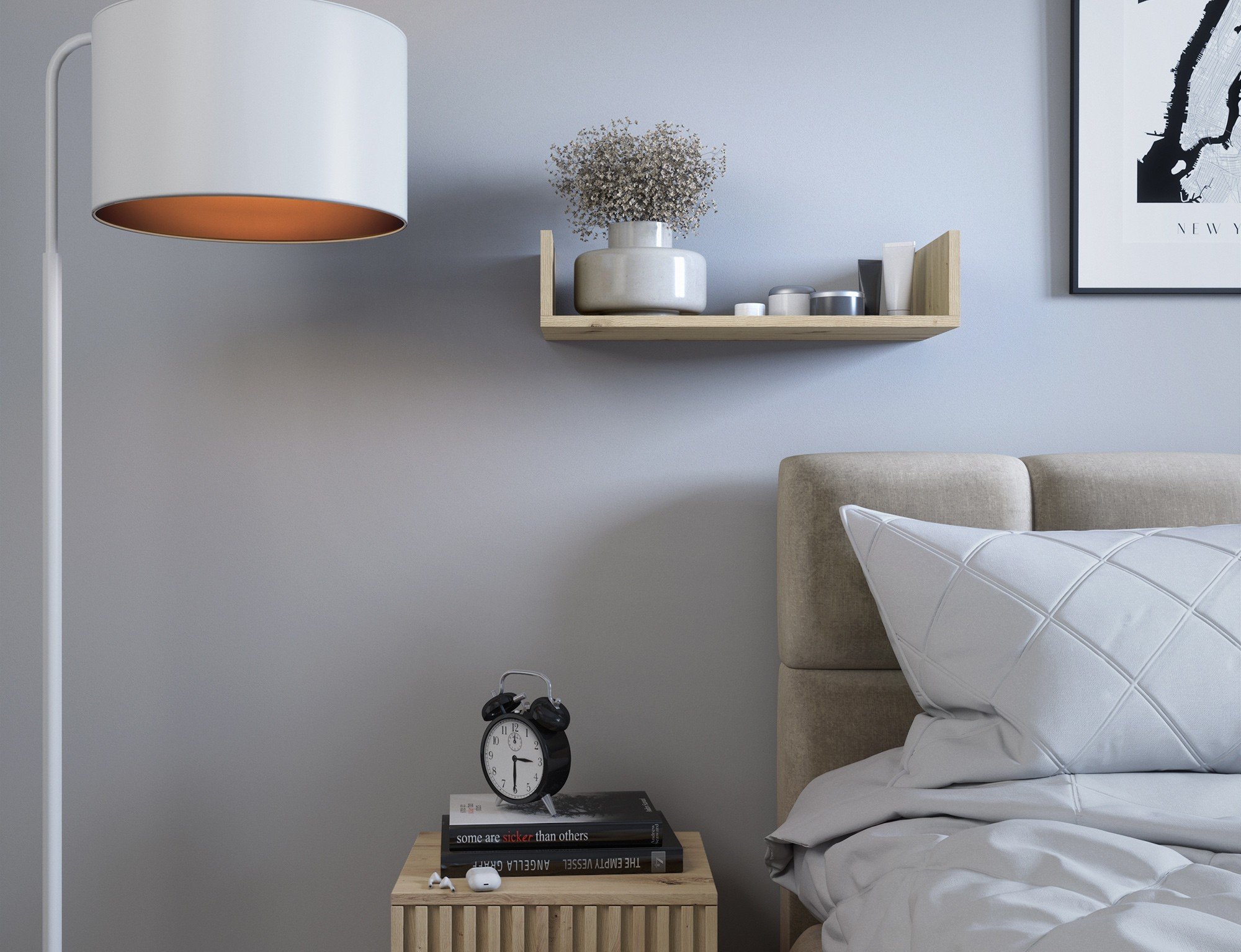 Nástěnná police Vissta je ideálním řešením pro ty, kteří oceňují moderní, minimalistický design, který se bezproblémově snoubí s interiéry ve skandinávském stylu. Vissta je všestranný dekorativní prvek, který se dokonale hodí do obývacího pokoje, ložnice nebo kanceláře. Vyznačuje se jednoduchým, ale moderním designem, který krásně vystaví vaše oblíbené dekorace, knihy nebo fotografie. Díky své minimalistické konstrukci police nepřetěžuje interiér, ale jemně ho doplňuje a dodává prostoru elegantní vzhled. Polička je vyrobena z vysoce kvalitní 16 mm laminované dřevotřísky, což zajišťuje odolnost a odolnost vůči každodennímu používání. Přední část police je zakončena PVC hranou v barvě, která ladí s dekorem, což jí dodává jednotný a estetický vzhled.