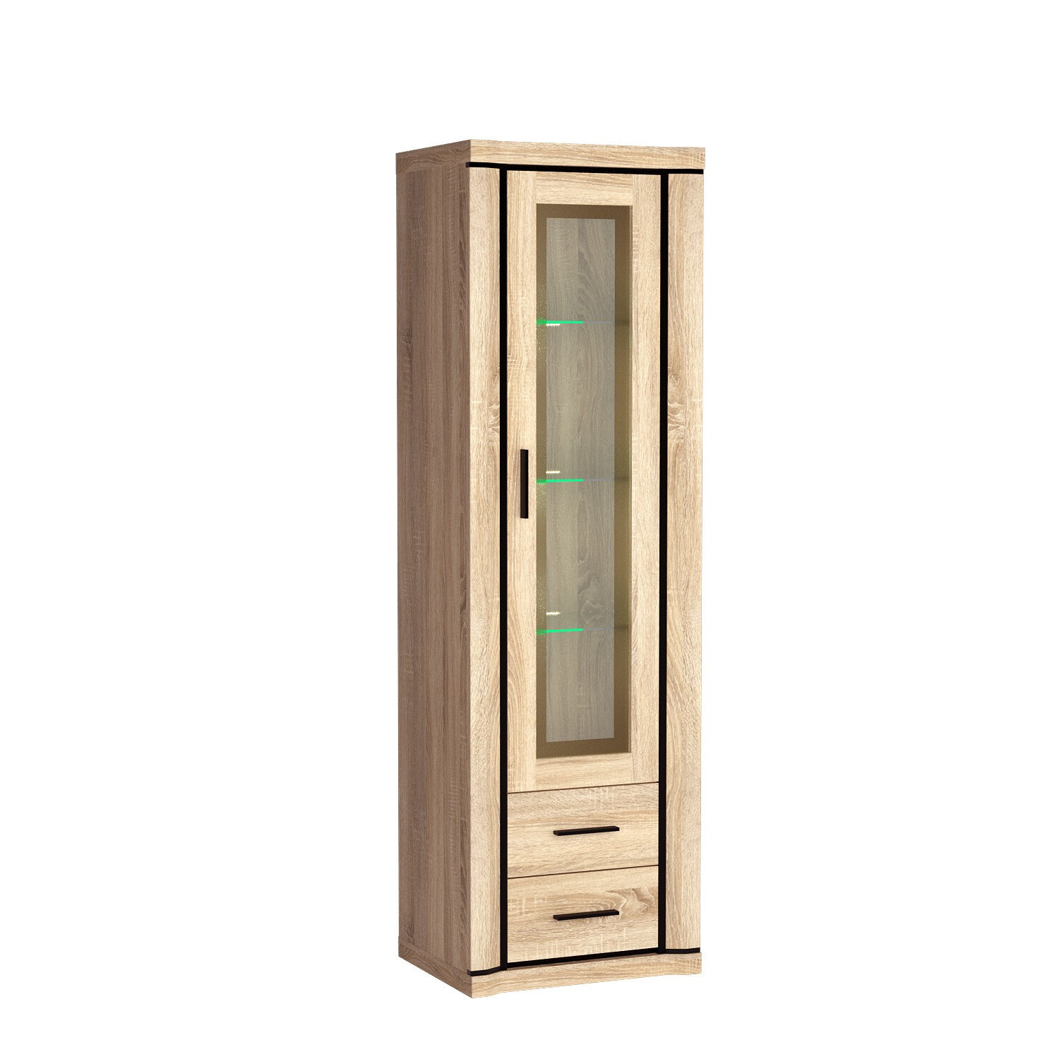 Krásná vitrína vyznačující se jednoduchým designem se bude dobře vyjímat nejen v obývacím pokoji, ale své místo si najde i v ložnici nebo kanceláři. Tři skleněné police uvnitř vitríny ji činí jedinečnou, vypadá úžasně a rozhodně na sebe upoutá pozornost. Kromě polic má nábytek dvě zásuvky, velmi funkční, ideální pro ukládání drobností, doplňků. Kovové úchytky ladící s černými dekoracemi v podobě lamel způsobí na každého mnoho dobrých dojmů. K dostání ve dvou barvách.