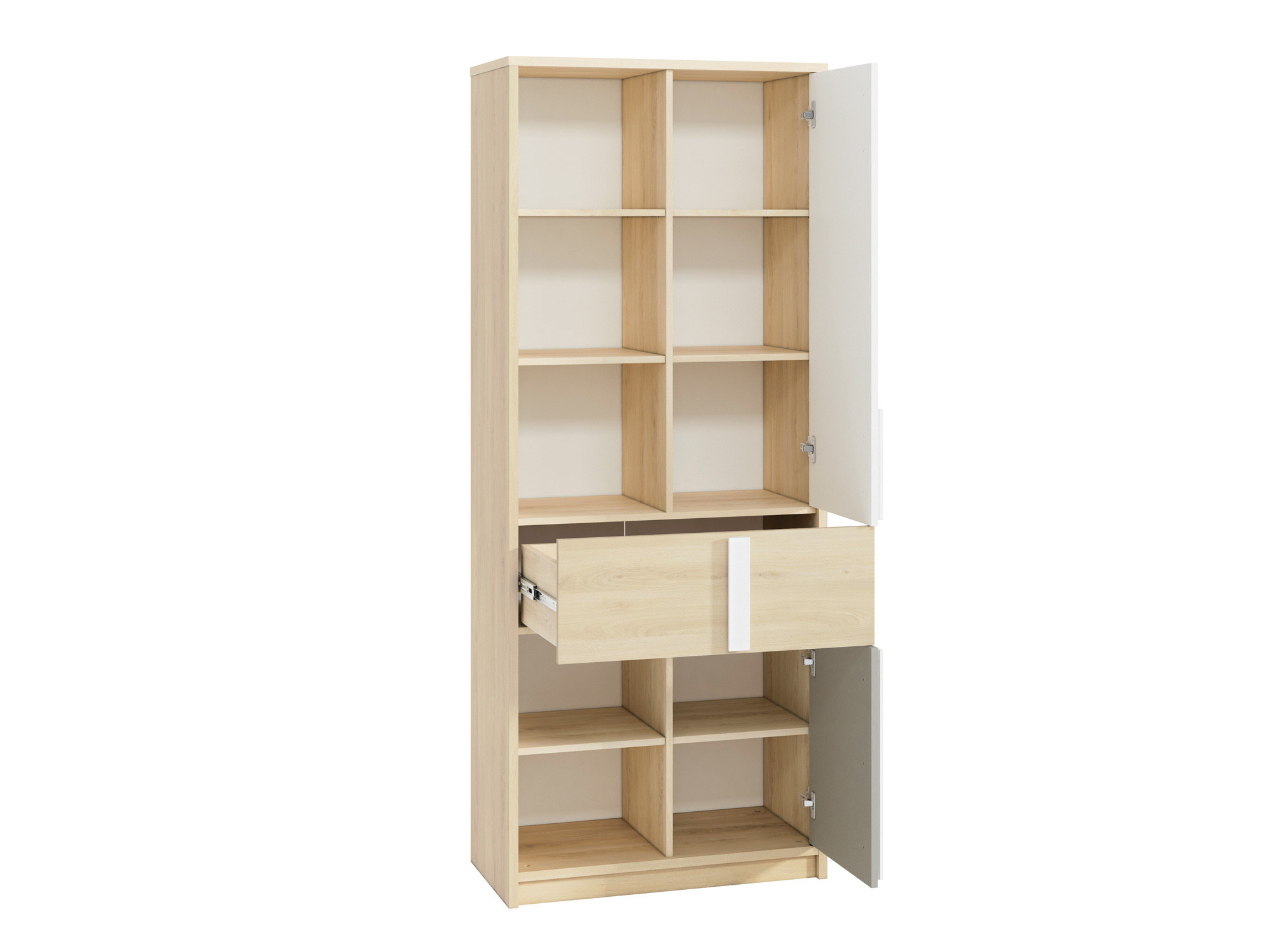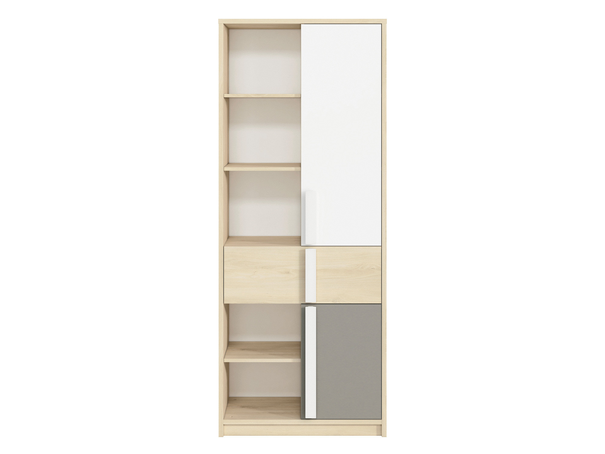 Naše knihovna DROP 03 byla vytvořena pro ukládání věcí mladých lidí. Do uzavřené části nábytku (police + zásuvka) můžete rychle schovat oblečení a na otevřených policích vystavit své oblíbené pomůcky a knihy. Zaoblené dřevěné rukojeti jsou vhodné pro děti a tělo je zcela bezpečné a vyvážené.