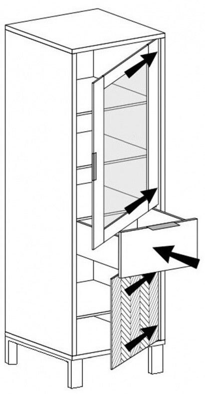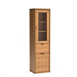 Vitrína z kolekce FONTI. Nábytek má dvě skříňky, jednu s plným čelem s jednou policí, která dělí prostor na polovinu, druhou skříňku se sklem se dvěma policemi. Prostorné zásuvky uprostřed skříně pojmou každý dobrý předmět. K dostání v barvě dub karamel.