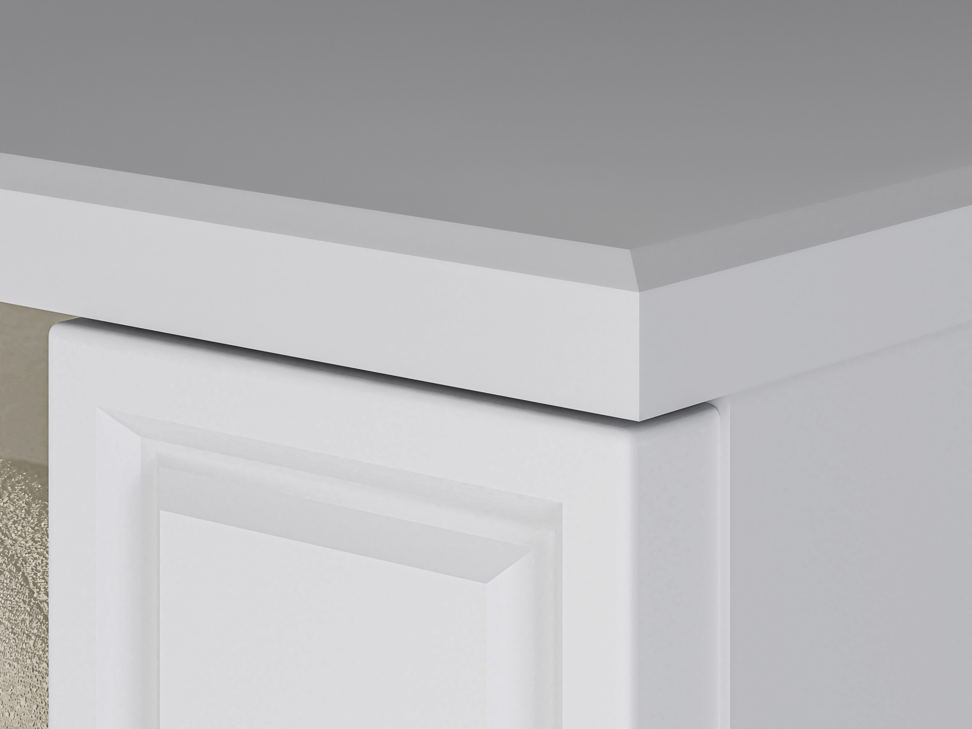 - Frézovaná MDF deska v bílém lesku je použita na dvířkách a vrchních částech nábytku