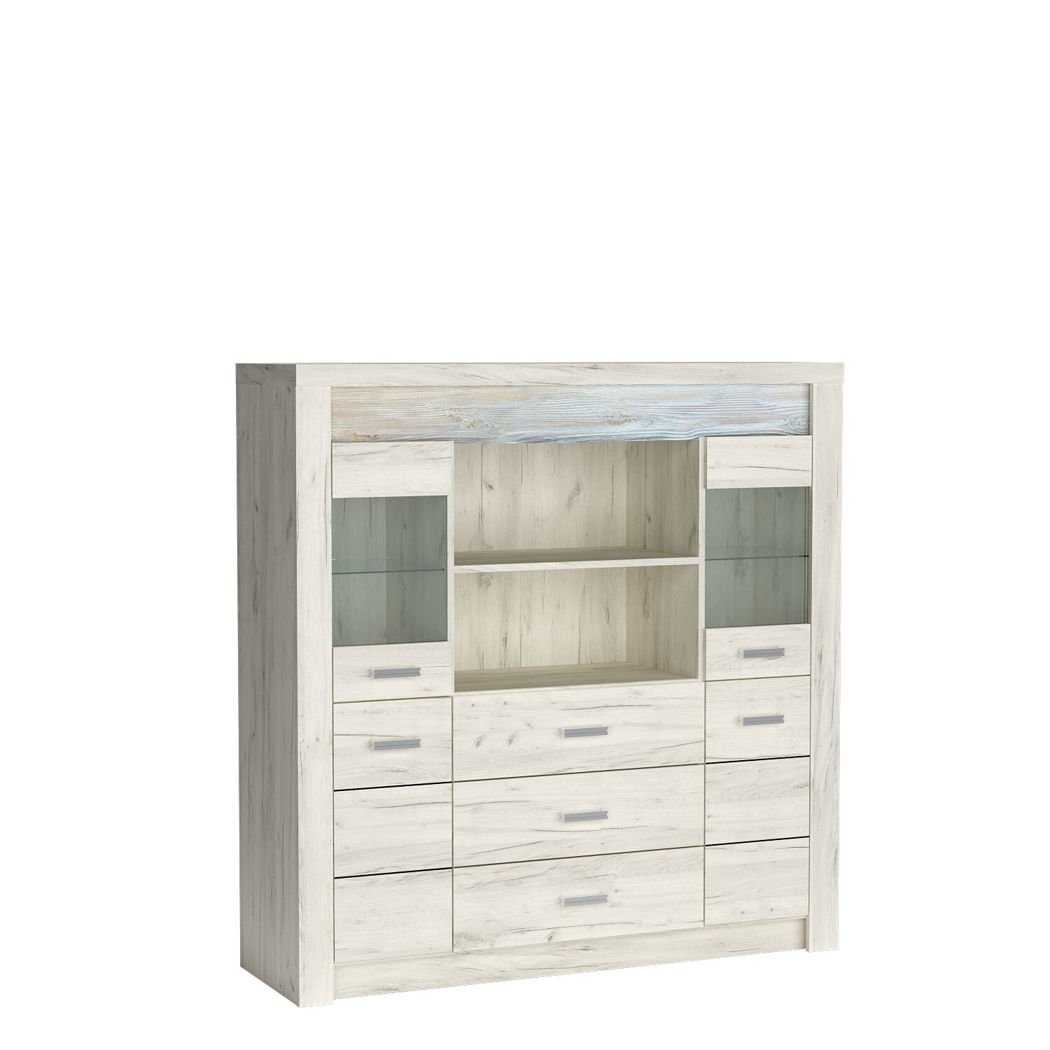 Velká komoda, která se bude dobře vyjímat ve vaší domácnosti. Má tři prostorné zásuvky a pět polic, do kterých budete moci uložit ozdoby, suvenýry, porcelánové soupravy, drobnosti a další. Díky skleněným čelům bude originální a dodá místnosti skvělou atmosféru. K dispozici je také varianta s masivními čely. Komoda je vyrobena ze silných a kvalitních laminovaných desek a kovových úchytek, které podtrhují bytelnost nábytku. K dostání ve třech barevných provedeních.