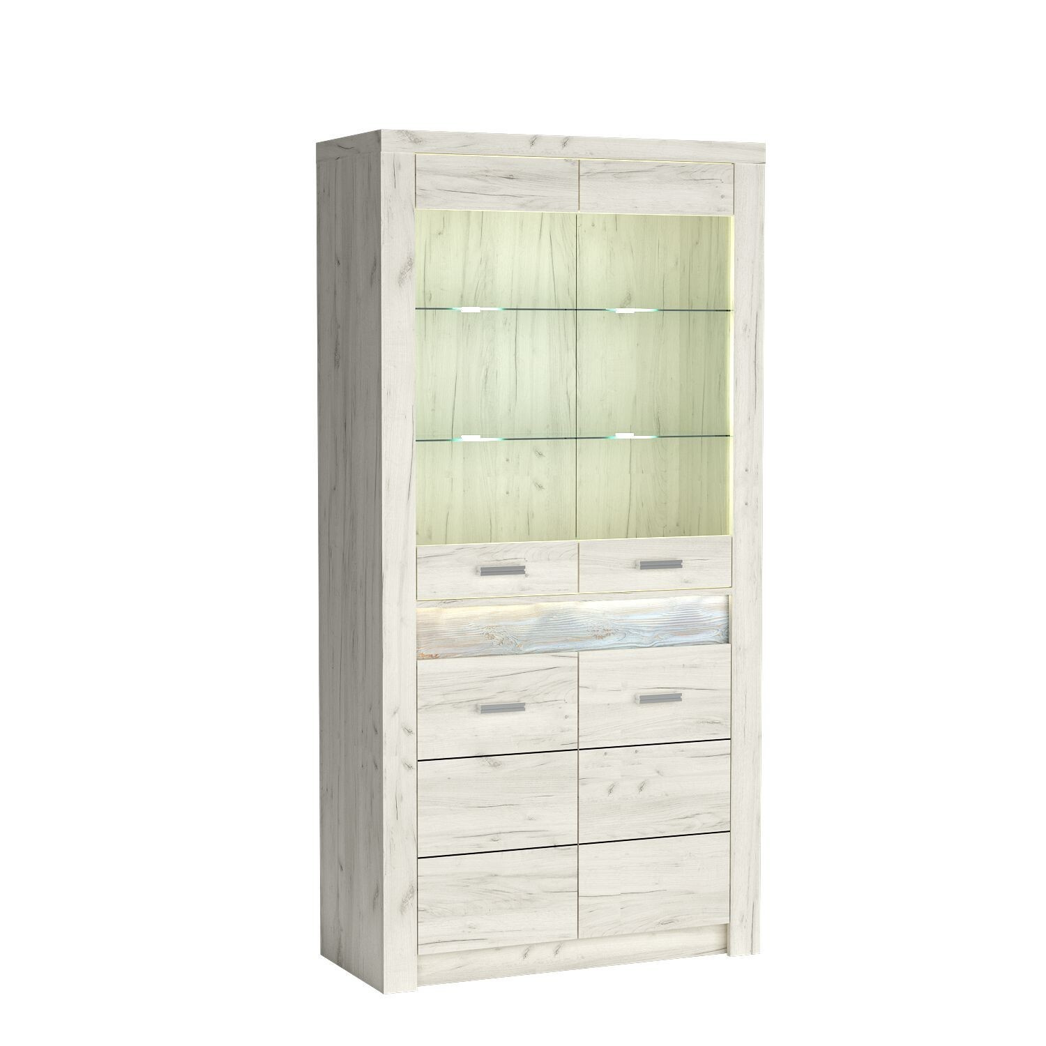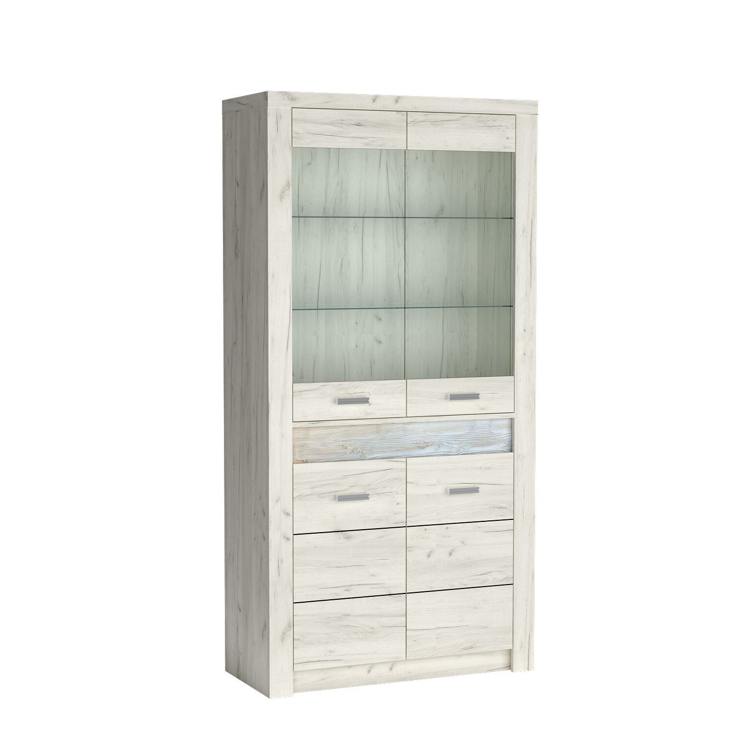 Vysoká vitrína se dvěma skleněnými policemi a skříňkou ve spodní části s jednou policí. Na výběr je skleněné čelo a masivní čelo. K dispozici je také možnost LED osvětlení horní části a polic. Další možnosti obohatí interiér. Vejde se do ní mnoho oblečení, doplňků, knih nebo dokumentů. Vitrína je ideální pro vystavení ozdob, porcelánu nebo upomínkových předmětů. K dostání ve třech barvách.