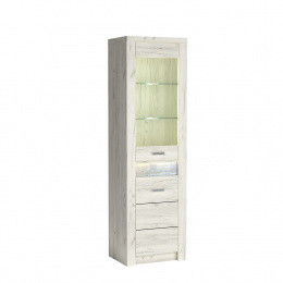 Vysoká vitrína se dvěma skleněnými policemi a skříňkou ve spodní části s jednou policí. Na výběr je skleněné čelo a masivní čelo. K dispozici je také možnost LED osvětlení horní části a polic. Další možnosti obohatí interiér. Vejde se do ní mnoho oblečení, doplňků, knih nebo dokumentů. Vitrína je ideální pro vystavení ozdob, porcelánu nebo upomínkových předmětů. K dostání ve třech barvách.