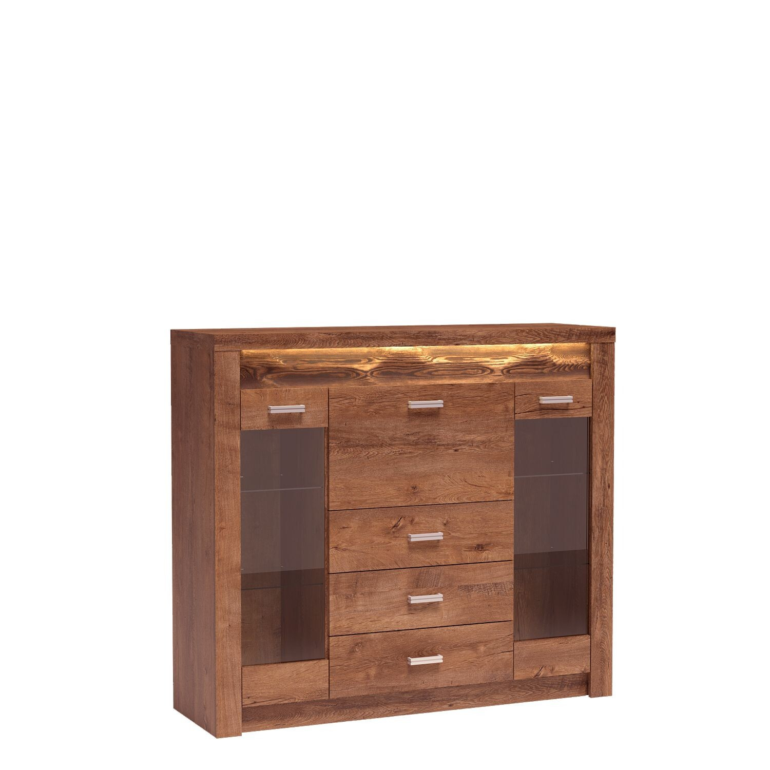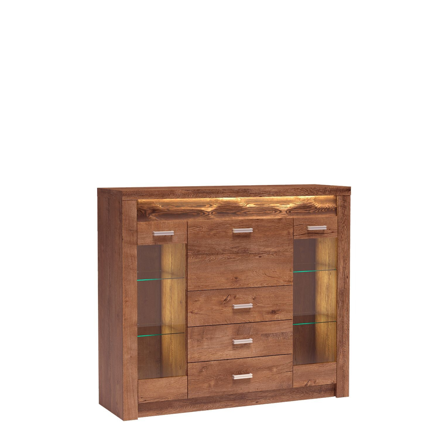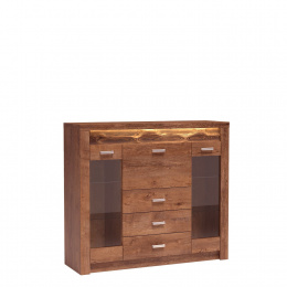 Vysoká komoda s vitrínami po stranách s dvojitými skleněnými policemi uprostřed. Uprostřed máme tři hluboké zásuvky a bar. Vitríny jsou ideální pro vystavení knih, porcelánu nebo suvenýrů. Nábytek má dostatek prostoru, je prostorný a originálního vzhledu. Hodí se do každé místnosti, obývacího pokoje, jídelny nebo předsíně. Svým designem zaujme mnoho hostů. Kovové úchytky podtrhují smysl pro detail. Nábytek je možné zakoupit s plnými čely. K dostání ve třech barvách.