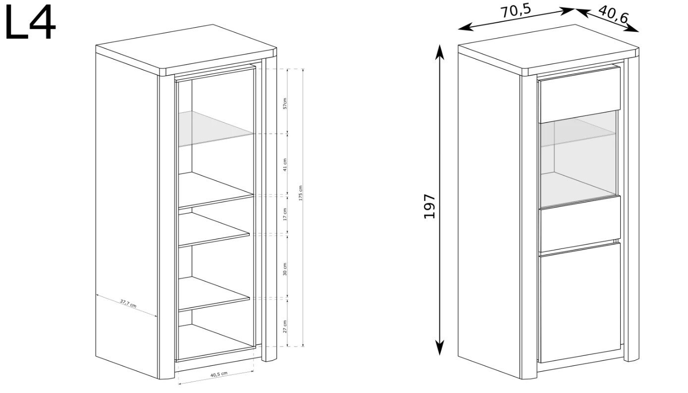 Dokonalá kombinace korpusu ribbeck, čelních ploch v bílém lesku a prosklení. Taková vitrína bude skvělým dotvořením našeho interiéru. Přídavné LED osvětlení skleněných polic vystaví porcelánové nádobí, krystaly nebo elegantní šálky. Vitrínu lze použít také jako knihovnu, do které můžeme uložit naše cenné knihy. Je univerzální, dvířka vitríny lze přišroubovat tak, aby se otevírala vpravo nebo vlevo.
