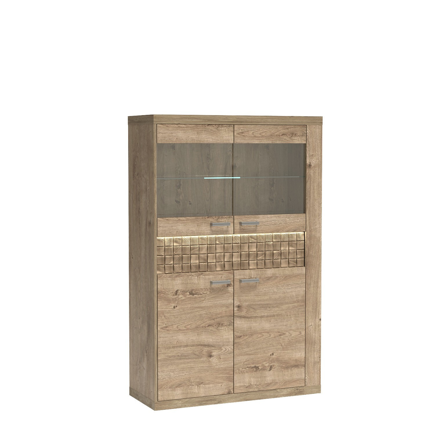 Vitrína z kolekce Natural. Horní skříňky mají prosklenou přední část a za nimi skleněnou polici. Spodní dvířka jsou celá prosklená a uprostřed mají poloprostorovou dělící polici. Mezi skříňkami je jedna velká zásuvka se systémem Push To Open, který podtrhuje měkkost nábytku. Kovové úchytky a tiché zavírání zdůrazňují smysl pro detail. Ideální do obývacího pokoje, jídelny nebo předsíně. Mnohé překvapí svým vzhledem. K dispozici v jedné barvě.