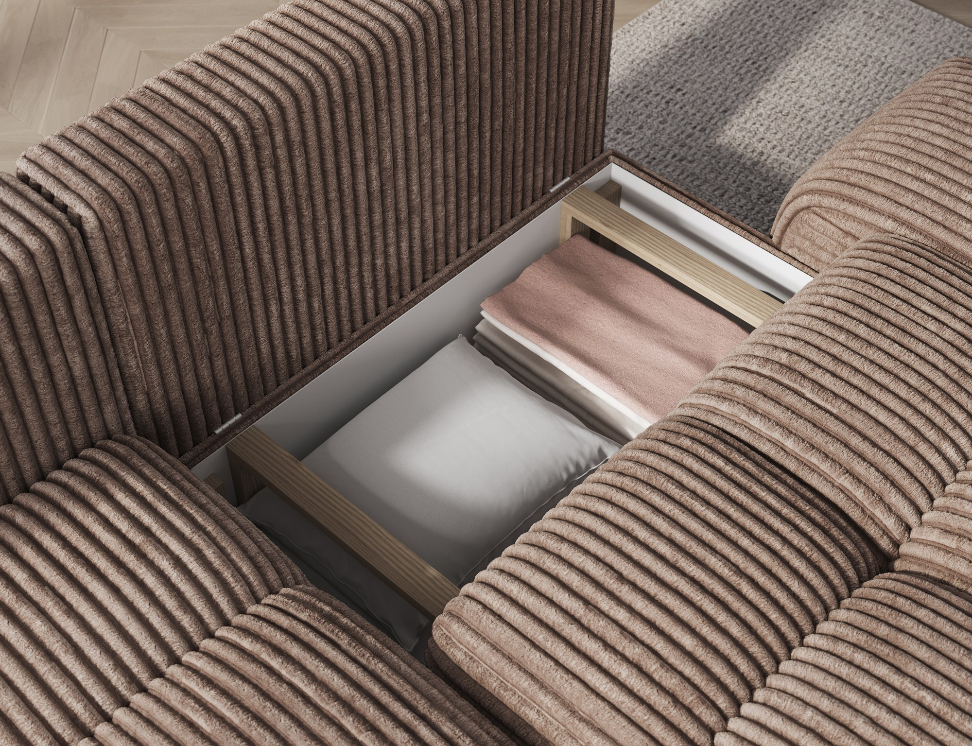 Tato sedací souprava je vybavena praktickým úložným prostorem, který vám umožní snadno uschovat deky, polštáře nebo jiné předměty, které chcete mít po ruce, ale zároveň je mít úhledně uklizené. Díky možnosti rozkládání se sedací souprava snadno promění v pohodlné lůžko s plochou na spaní o rozměrech 95 x 205 cm, což je ideální pro hosty nebo pro příležitostné přespání.