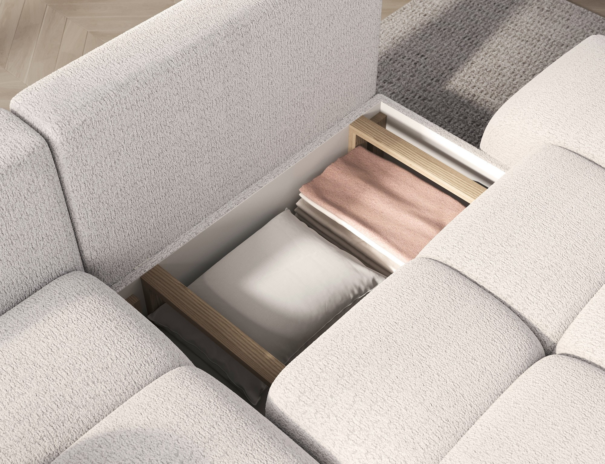Tato sedací souprava je vybavena praktickým úložným prostorem, který vám umožní snadno uschovat deky, polštáře nebo jiné předměty, které chcete mít po ruce, ale zároveň je mít úhledně uklizené. Díky možnosti rozkládání se sedací souprava snadno promění v pohodlné lůžko s plochou na spaní o rozměrech 95 x 205 cm, což je ideální pro hosty nebo pro příležitostné přespání.