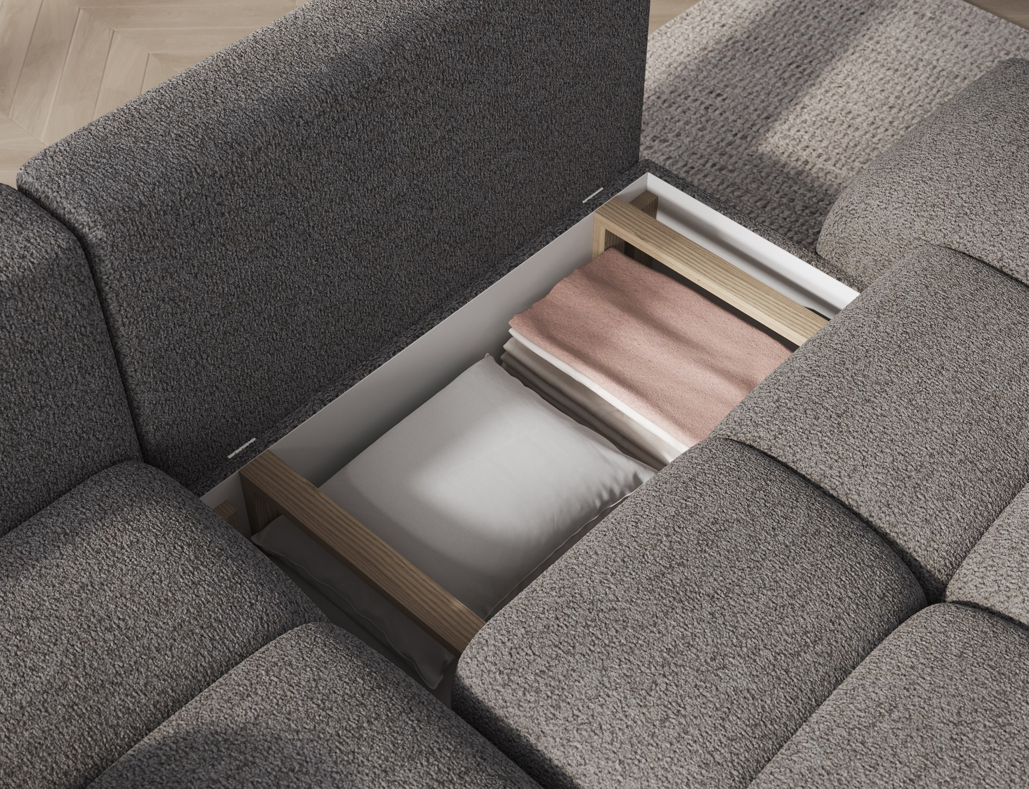 Tato sedací souprava je vybavena praktickým úložným prostorem, který vám umožní snadno uschovat deky, polštáře nebo jiné předměty, které chcete mít po ruce, ale zároveň je mít úhledně uklizené. Díky možnosti rozkládání se sedací souprava snadno promění v pohodlné lůžko s plochou na spaní o rozměrech 95 x 205 cm, což je ideální pro hosty nebo pro příležitostné přespání.