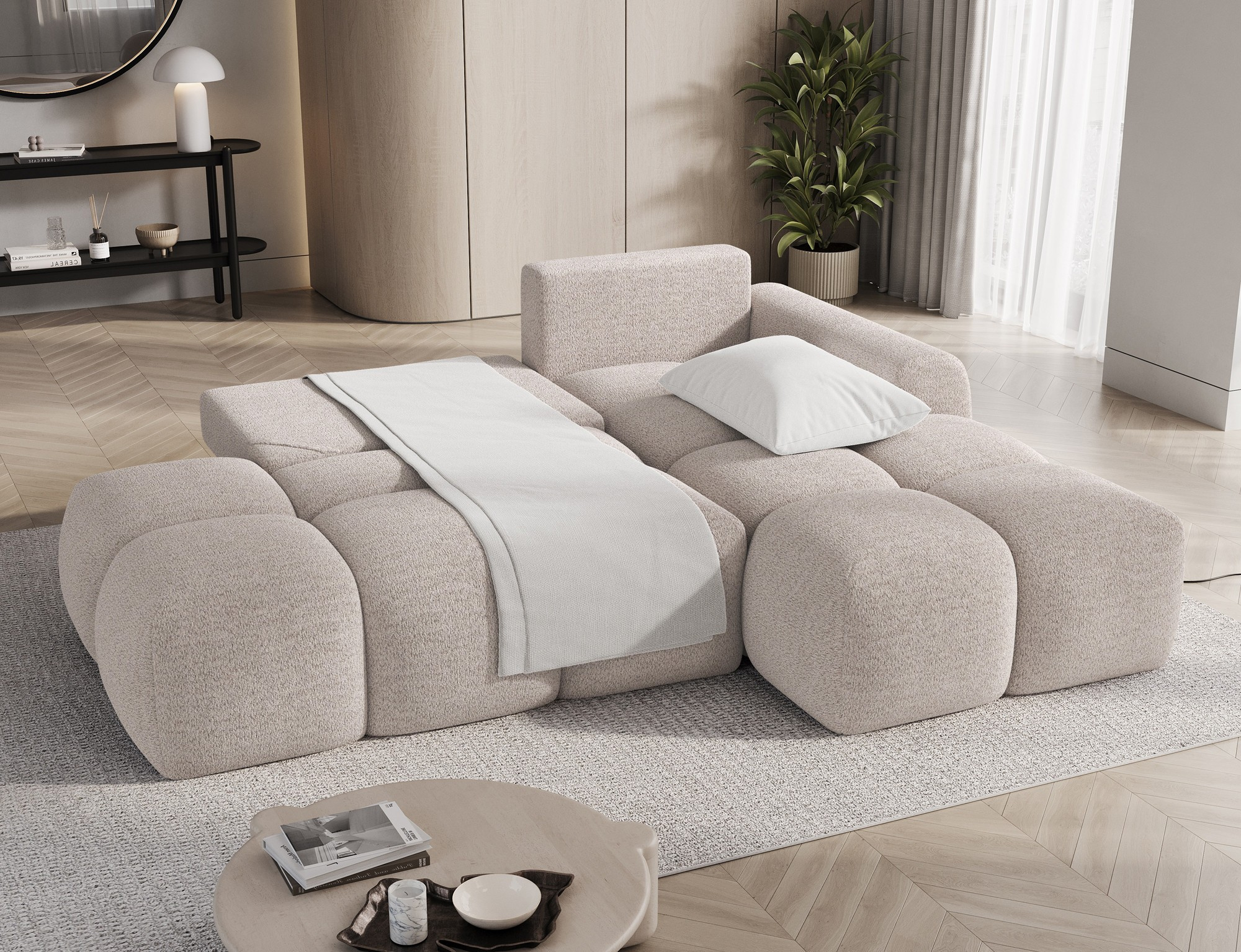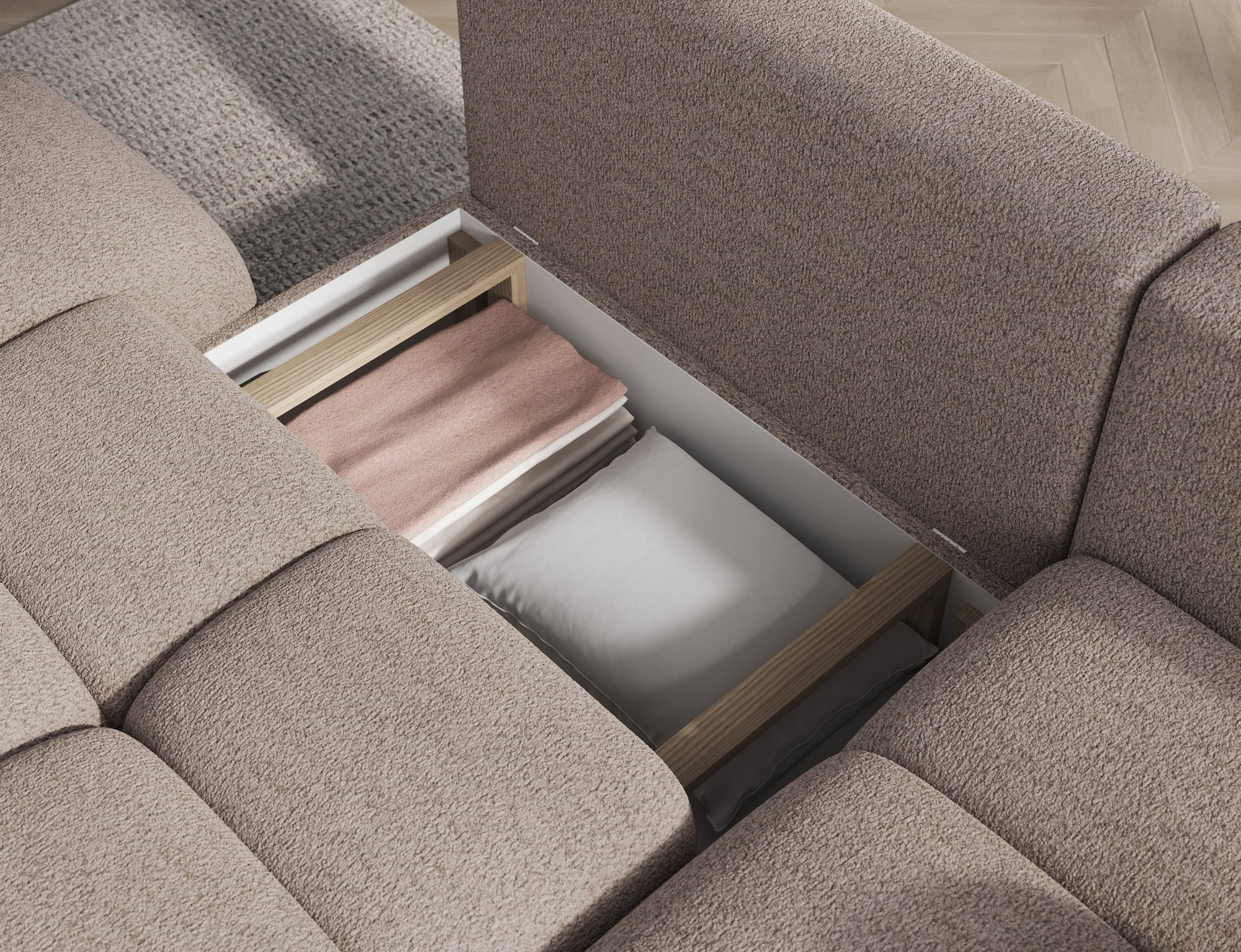 Tato sedací souprava je vybavena praktickým úložným prostorem, který vám umožní snadno uschovat deky, polštáře nebo jiné předměty, které chcete mít po ruce, ale zároveň je mít úhledně uklizené. Díky možnosti rozkládání se sedací souprava snadno promění v pohodlné lůžko s plochou na spaní o rozměrech 95 x 205 cm, což je ideální pro hosty nebo pro příležitostné přespání.