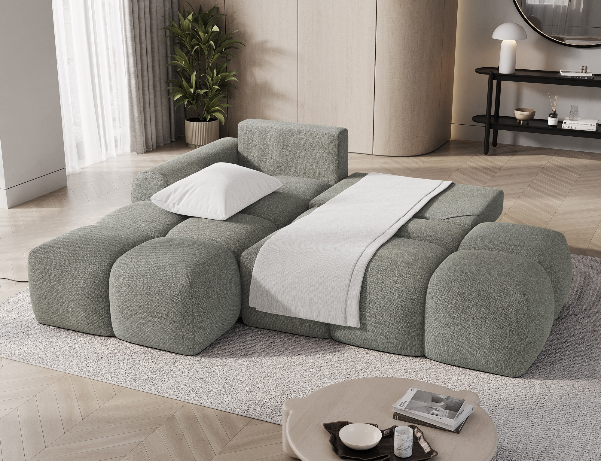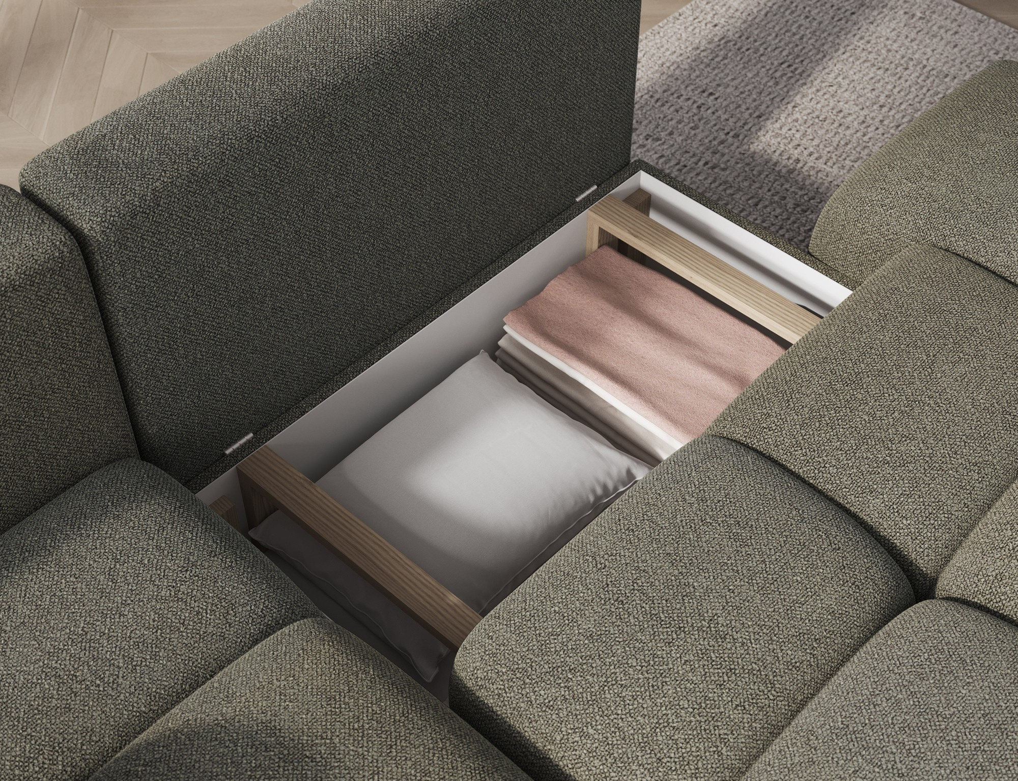 Tato sedací souprava je vybavena praktickým úložným prostorem, který vám umožní snadno uschovat deky, polštáře nebo jiné předměty, které chcete mít po ruce, ale zároveň je mít úhledně uklizené. Díky možnosti rozkládání se sedací souprava snadno promění v pohodlné lůžko s plochou na spaní o rozměrech 95 x 205 cm, což je ideální pro hosty nebo pro příležitostné přespání.