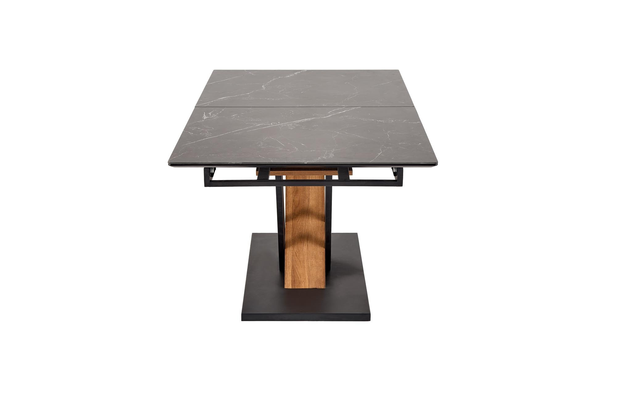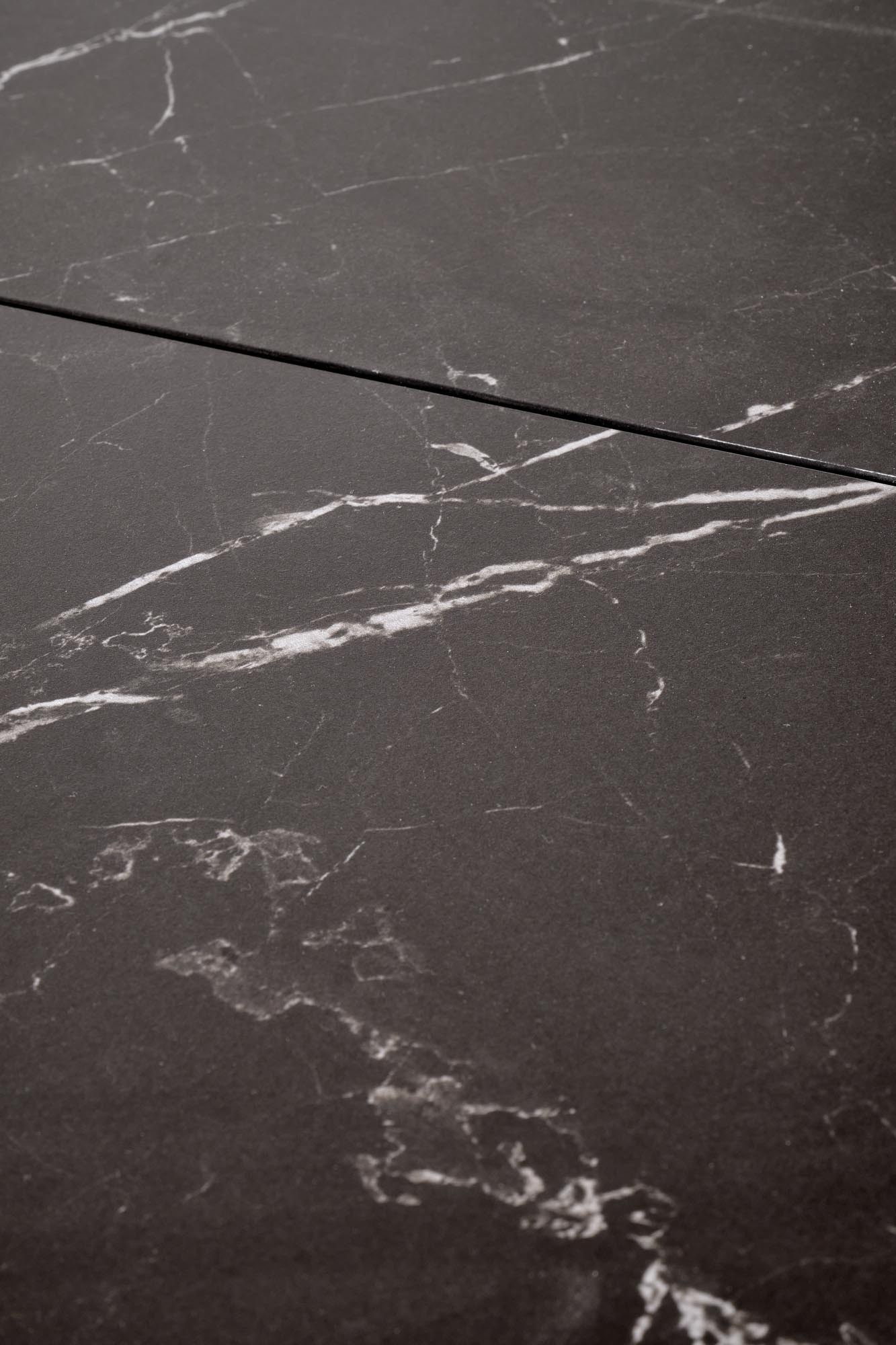 rozkládací stůl, materiál: slinutý / lakovaný MDF / dýhovaný MDF / práškově lakovaná ocel, barva: deska - černý mramor, nohy - zlatý dub / černá