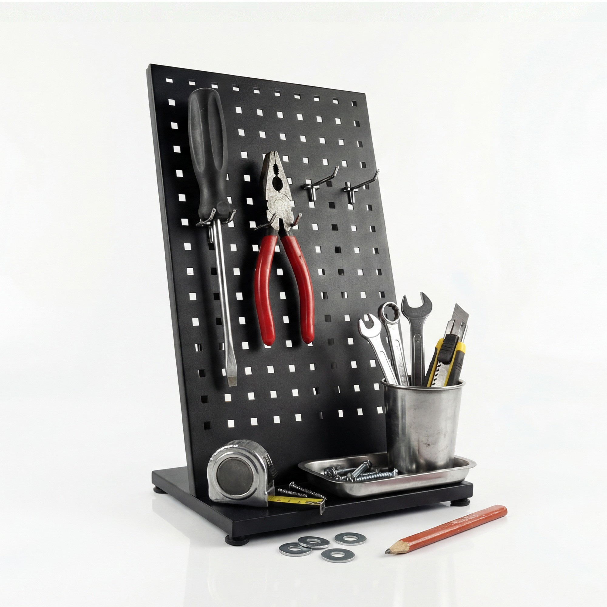 Zapomeňte na složité montáže a vrtání do zdi. Naše perforovaná tabule je navržena tak, aby stála samostatně, což vám dává naprostou svobodu při jejím umístění. Můžete ji postavit na pracovní stůl, lavici, nebo dokonce i do skříně. A pokud potřebujete změnit uspořádání dílny, jednoduše ji přenesete na jiné místo. Díky nízké hmotnosti je to hračka!