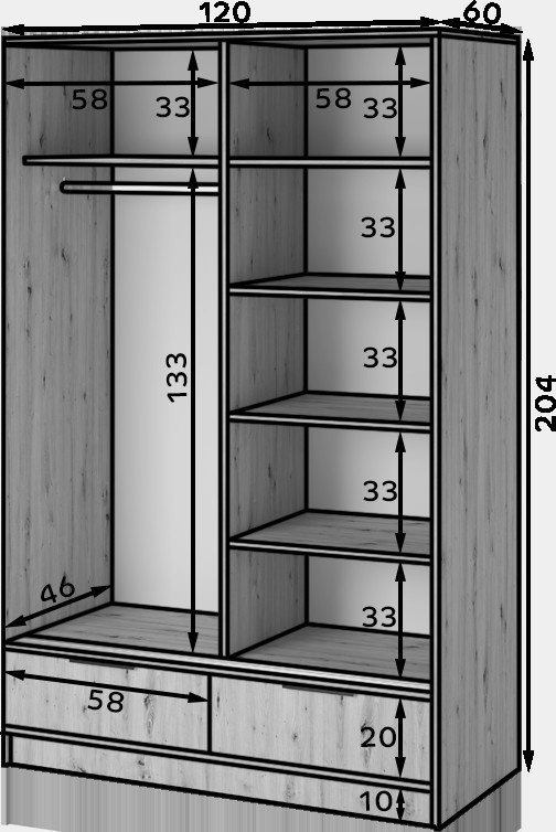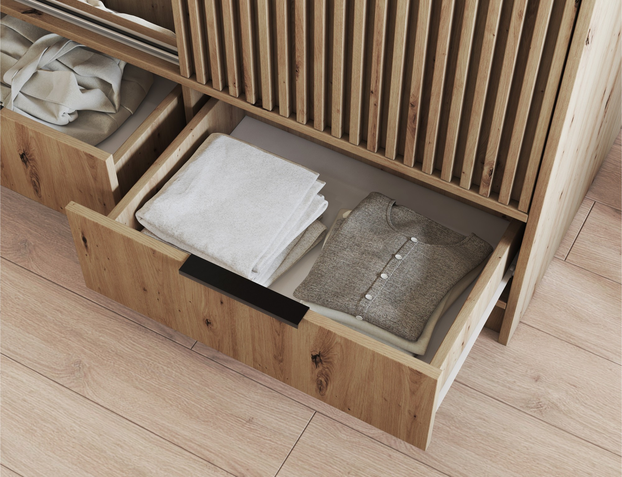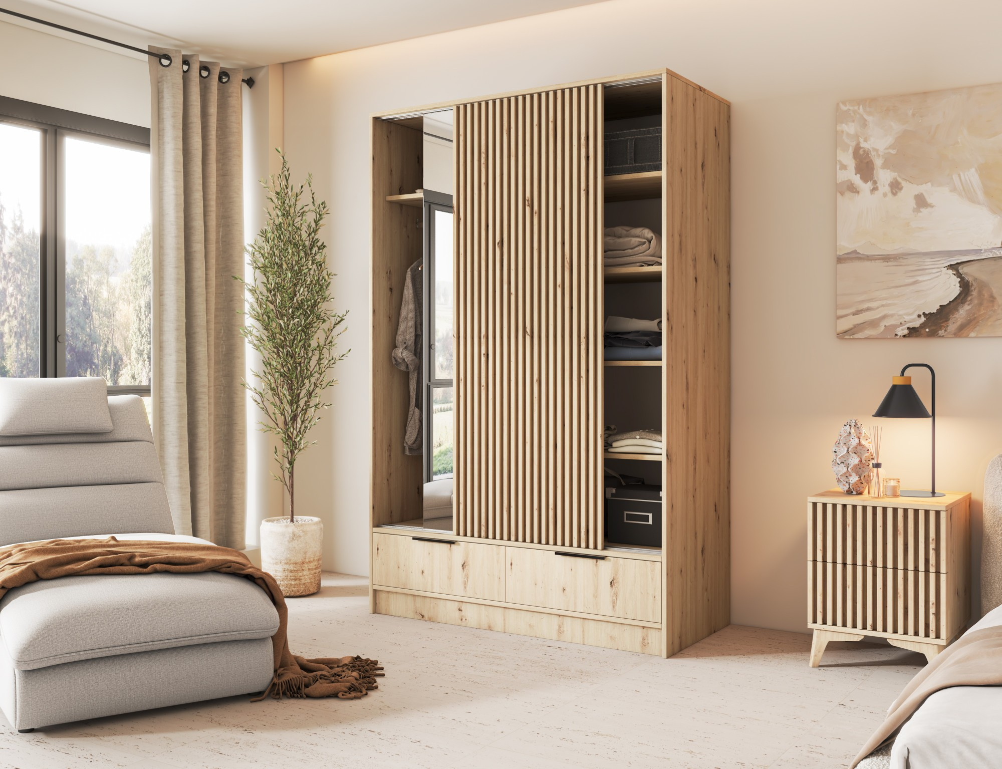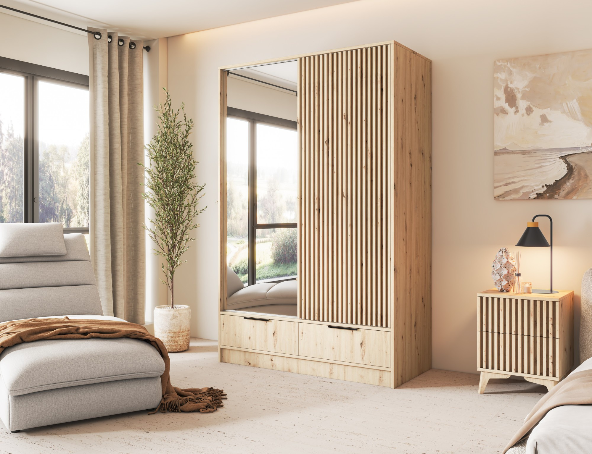 Dvoudveřová posuvná skříň se zrcadlem, 120 cm v barvě dubu artisan, je ideálním řešením pro ložnici, šatnu nebo chodbu. S kompaktními rozměry 120x60x204 cm je prostorný, ale nezabírá mnoho místa. Moderní posuvné dveře umožňují snadné použití i v malých místnostech, zatímco velké zrcadlo vizuálně zvětšuje interiér.Šatní skříň je vyrobena z laminované dřevotřísky, její čela a tělo jsou opatřeny odolným ABS povrchem, který zajišťuje odolnost proti poškození. Interiér je navržen s ohledem na funkčnost – zahrnuje závěsnou tyč na oblečení, police s nosností až 8 kg a dvě prostorné zásuvky s válečkovými pojezdy pro plynulé otevírání. Černé kovové úchyty dodávají šatní skříni moderní vzhled, zatímco plastové pojezdy zajišťují stabilitu a tichý chod dveří. Model lze navíc připevnit ke zdi pro zvýšenou bezpečnost.Stylová a funkční řemeslná dubová posuvná skříň se hodí jak do moderních, tak klasických interiérů, nabízí elegantní design a snadné použití. Ideální pro váš domov – objednejte ještě dnes a užijte si vynikající organizaci prostoru!