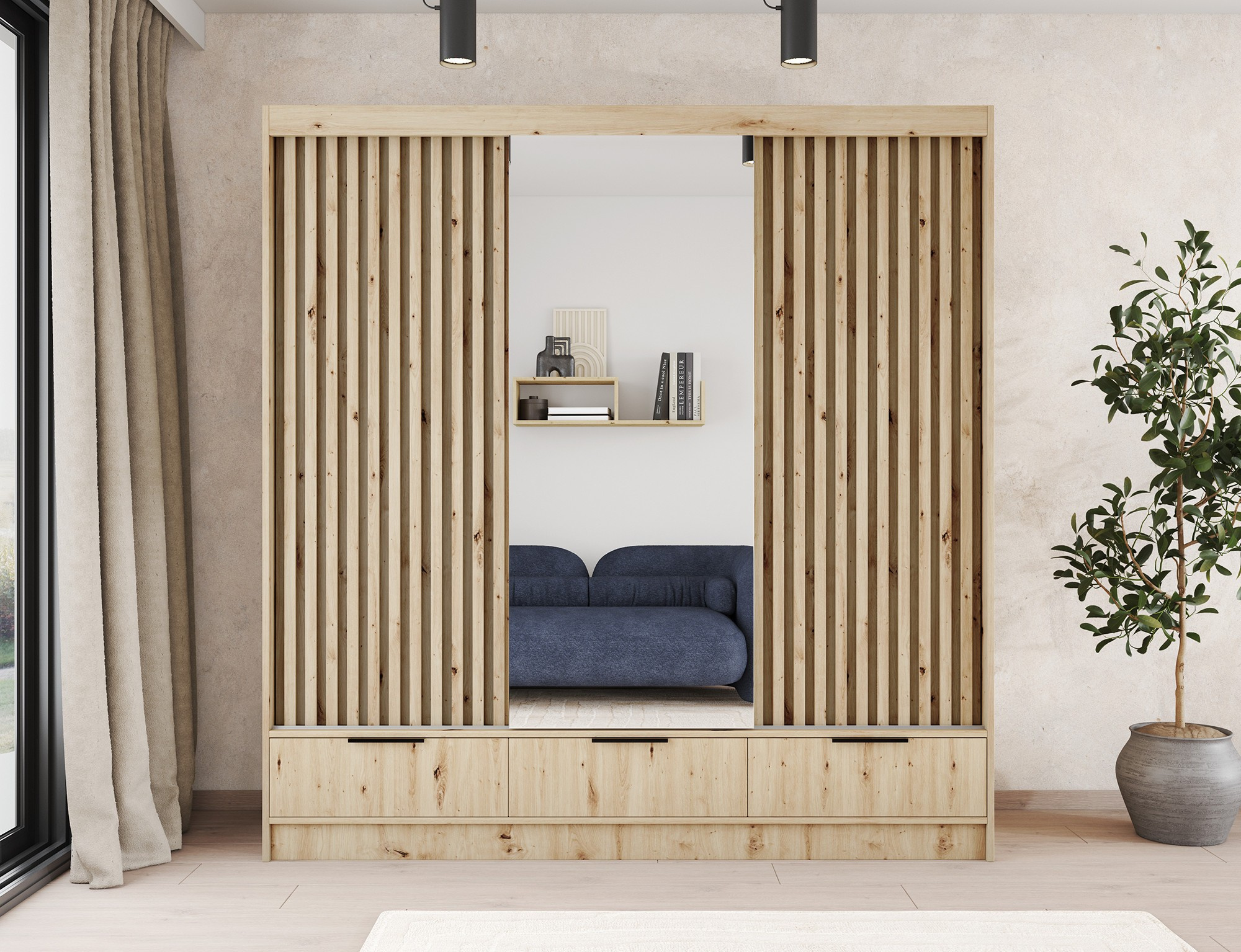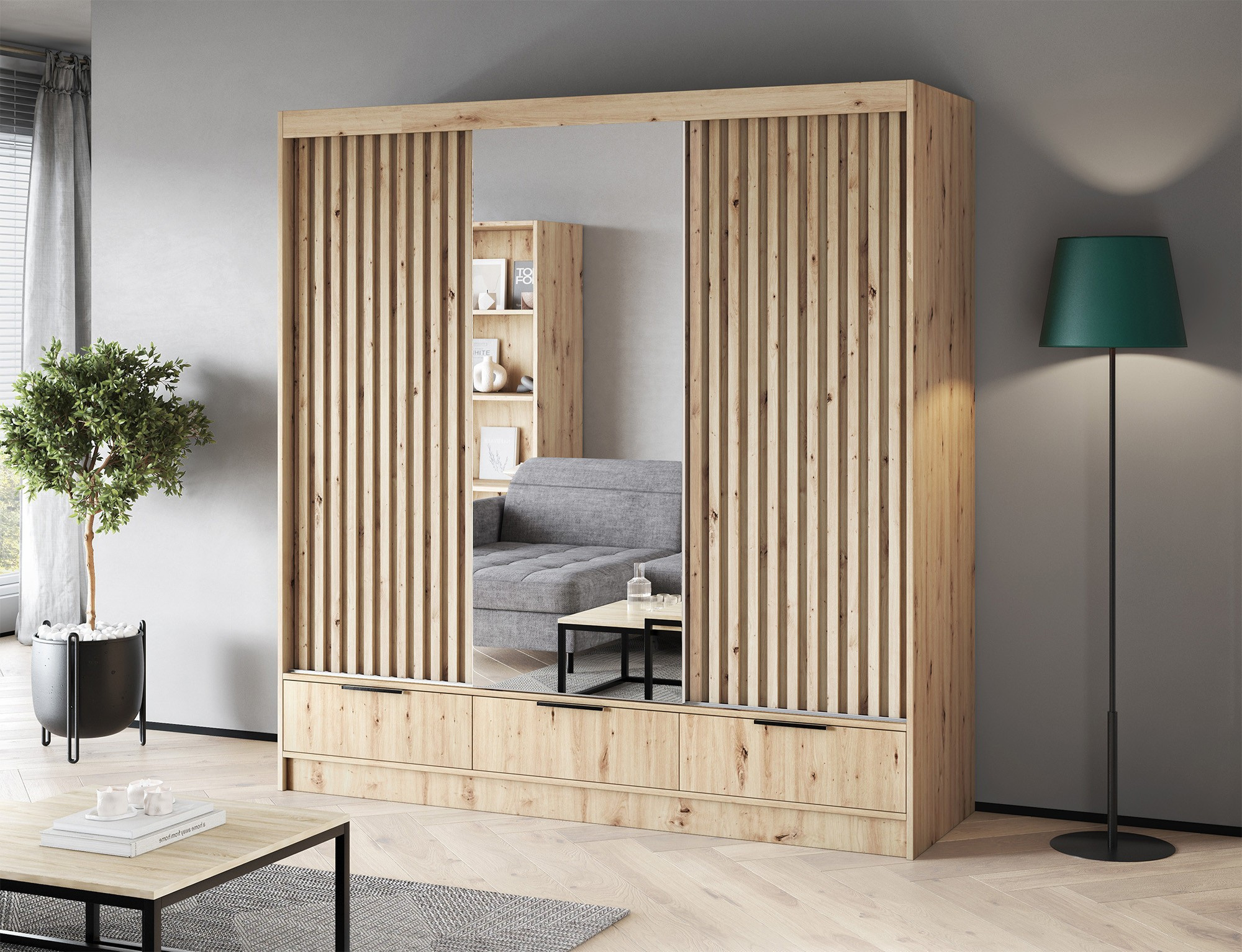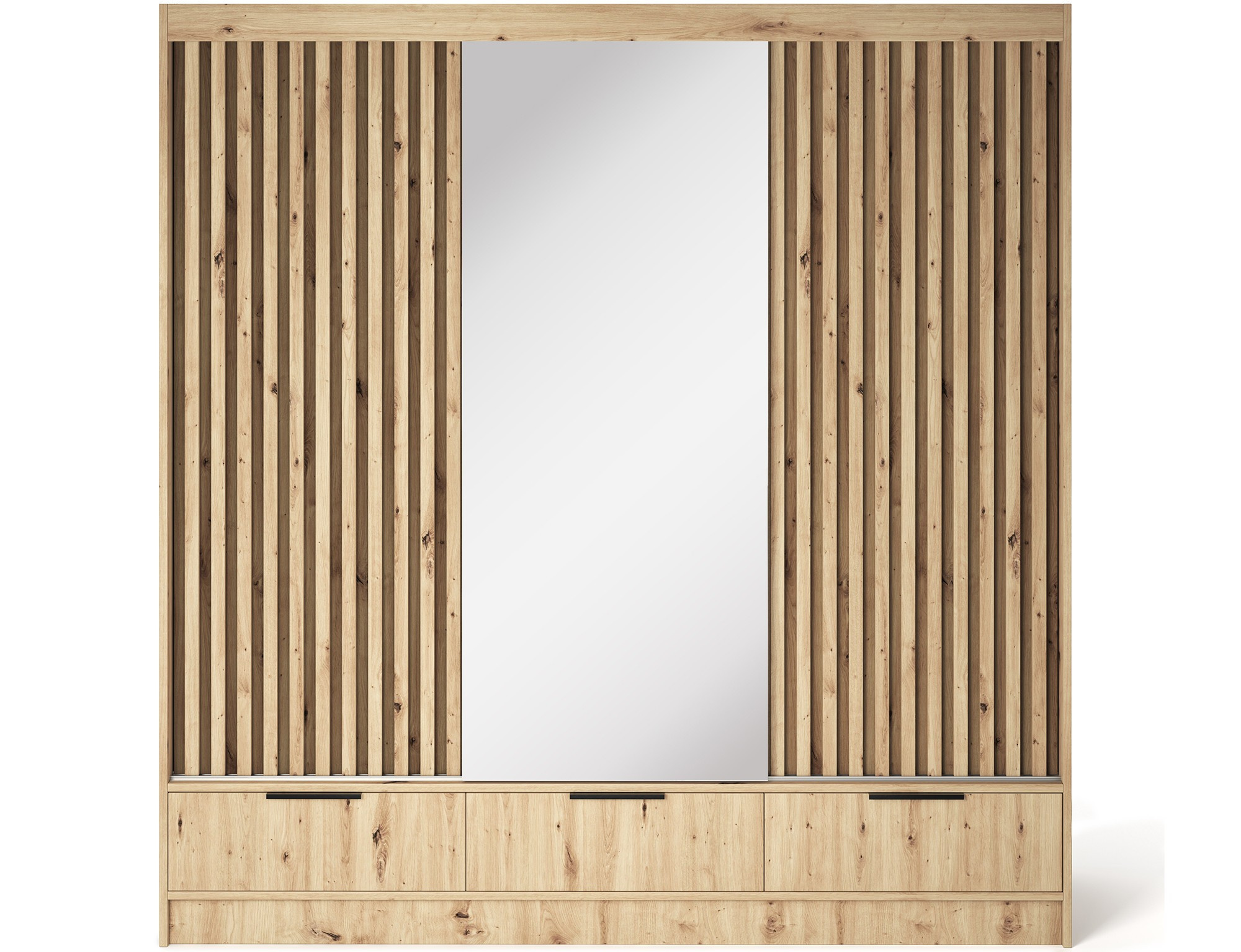 Třídveřová posuvná skříň Voodi III 180x204x60 cm v barvě dubu artisan s velkým zrcadlem je moderním a funkčním řešením pro ložnici, šatnu nebo chodbu, které kombinuje prostornost s kompaktními rozměry, což ji činí ideální i pro menší interiéry; je vyrobena z odolné laminované dřevotřísky s ABS hranami, nabízí vysokou odolnost proti poškození, zatímco pečlivě navržený interiér obsahuje praktickou závěsnou tyč, police s nosností až 8 kg a tři prostorné zásuvky s válečkovými vodítky zajišťujícími hladké otevírání; velké zrcadlo opticky zvětšuje prostor, černé kovové úchyty dodávají elegantní vzhled a plastové kluzáky zajišťují stabilní a tichý pohyb dveří; dodatečná možnost montáže na stěnu zvyšuje bezpečnost, což činí skříň Voodi III ideální volbou pro ty, kteří hledají stylový, odolný a praktický kus nábytku pro ukládání oblečení a doplňků – zvolte kvalitu a objednejte ještě dnes.