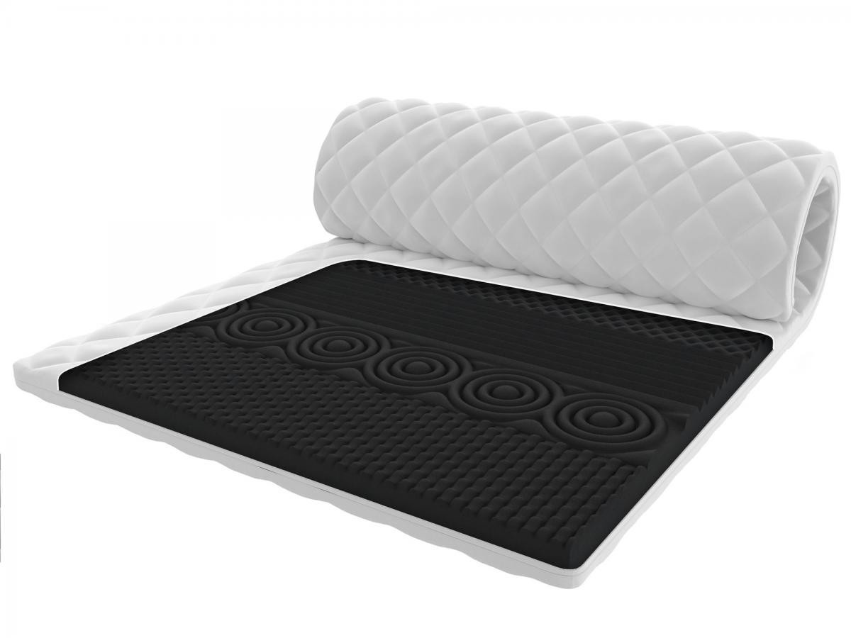 Struktura topperu: Profilovaná 7zónová vysoce odolná pěna HR H30: Profilovaný povrch rozděluje matraci do 7 zón, díky čemuž se pěna dokonale přizpůsobí tvaru těla. Má nestejnoměrnou buněčnou strukturu, a proto dosahuje lepších parametrů pohodlí a pružnosti. Tento materiál se vyznačuje mimořádnou trvanlivostí a odolností proti deformaci. Navíc získává svůj původní tvar dvakrát rychleji než standardní polyuretanová pěna. To znamená, že profilovaná HR pěna rychleji reaguje na změny polohy těla během spánku. Antialergický prošívaný potah Premium 200 g/m² s membránovou strukturou je vyroben z nejkvalitnějších prvotřídních hypoalergenních materiálů, které zajišťují výjimečnou měkkost, svěžest a mimořádné pohodlí a spokojenost s jeho používáním. Zabraňuje pronikání nečistot do matrace, chrání před pronikáním bakterií, hub, plísní a roztočů.Potah je opatřen všitým zipem, který umožňuje jeho snadné sejmutí pro praní. Výhody: pod vlivem tlaku těla se dokonale přizpůsobí tvaru a siluetě uživatele. Zmírňuje tlak v oblasti kyčlí a krku. Odnímatelný potah - zapínání na zip. Masážní efekt Specifikace: tvrdost: H3 středně tvrdá, tloušťka: 8 cm. Složení: HR pěna H30: 7 cm, potah: 1 cm.