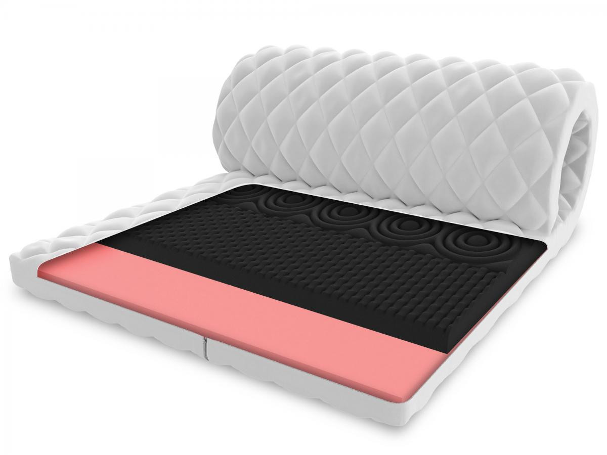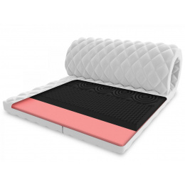 Topper je vyroben z profilované 7mi-zónové vysoce odolné pěny HR H30. Profilovaný povrch rozděluje matraci do 7 zón, díky čemuž se pěna dokonale přizpůsobí tvaru těla. Má nestejnoměrnou buněčnou strukturu a proto dosahuje lepších parametrů pohodlí a pružnosti. Tento materiál se vyznačuje mimořádnou trvanlivostí a odolností proti deformaci. Navíc získává svůj původní tvar dvakrát rychleji než standardní polyuretanová pěna. To znamená, že profilovaná HR pěna rychleji reaguje na změny polohy těla během spánku. Druhou vrstvou topperu je termoplastická paměťová pěna VISCO. Díky svému jedinečnému složení a konstrukci reaguje na teplotu a tlak osoby, která na něm spí. Působí dojmem, že se do topperu ponoříte a spíte jako "na obláčku". Celé tělo je tak dobře podepřeno a spánek je mimořádně pohodlný a zdravý. Uvolňuje se také případný tlak v oblasti kyčlí a krku a bez zatížení se vrací do původního tvaru. Zabraňuje také růstu mikroorganismů. Antialergický prošívaný potah Premium 200 g/m² s membránovou strukturou je vyroben z nejkvalitnějších prvotřídních hypoalergenních materiálů, které zajišťují výjimečnou měkkost, svěžest a mimořádné pohodlí a spokojenost s jeho používáním. Zabraňuje pronikání nečistot do matrace, chrání před pronikáním bakterií, hub, plísní a roztočů. Potah je opatřen všitým zipem, který umožňuje jeho snadné sejmutí pro praní.