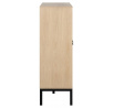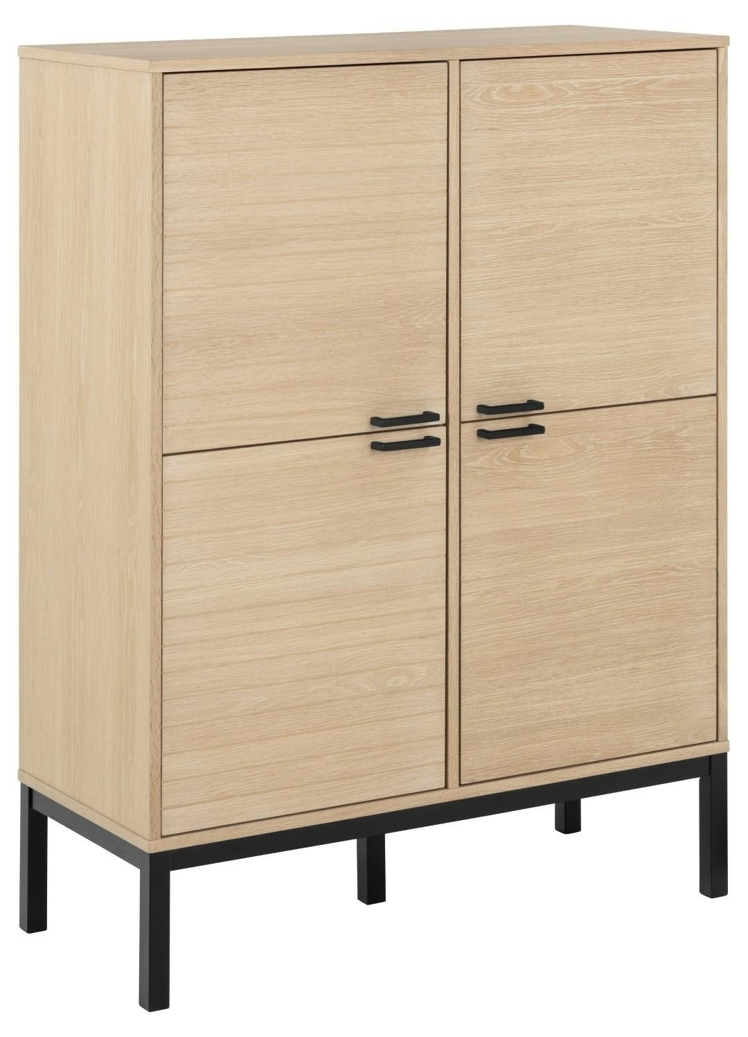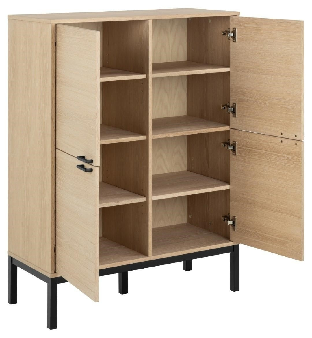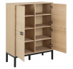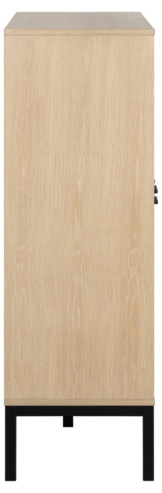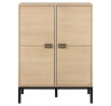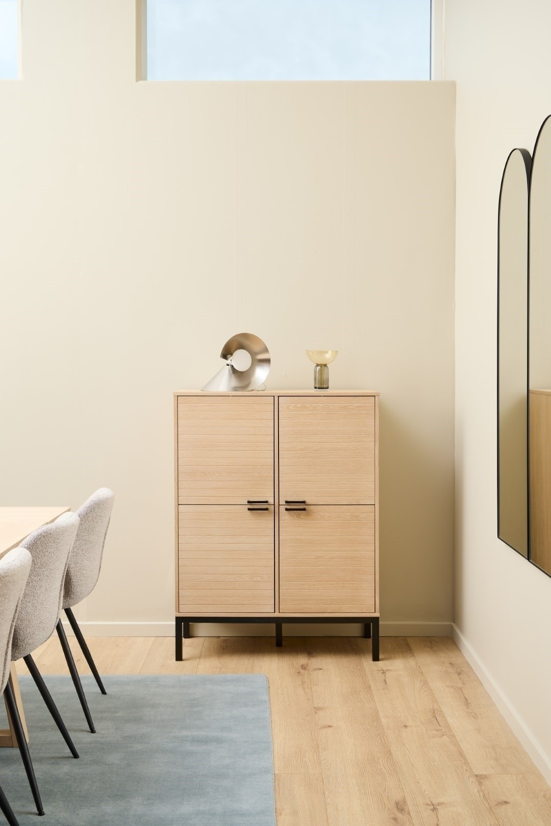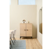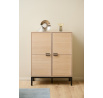 Tato efektní skříňka přináší do interiéru osvěžující energii. Díky kontrastnímu vzhledu, získanému kombinací bílého pigmentovaného olejovaného dubového dýhu a černého lakovaného dubového dýhu, skříň zvyšuje dynamiku v místnosti. Má 6 nastavitelných polic skrytých za 4 dveřmi zdobenými dekorativními lamelami. Materiál MDF deska s dubovou dýhou a kovová základna Vyžaduje montáž. Hmotnost: 43 kg