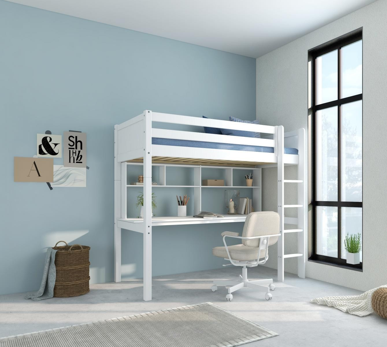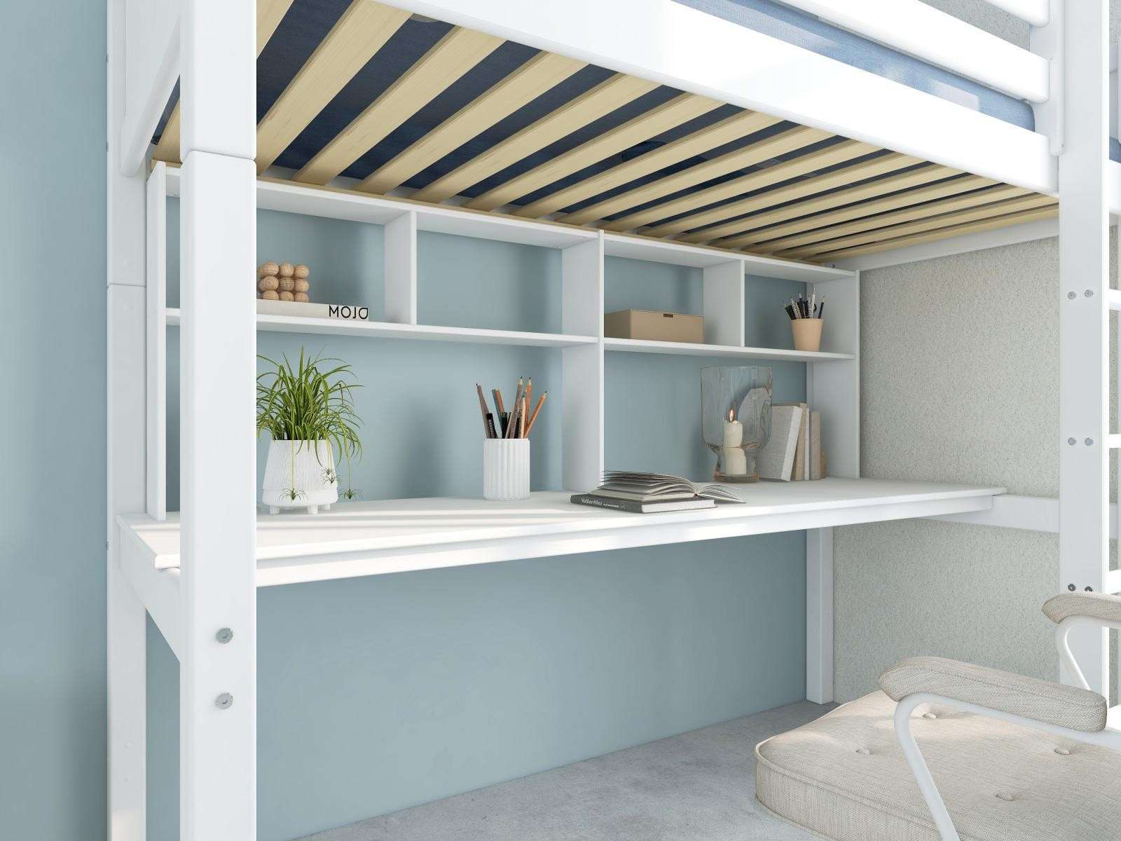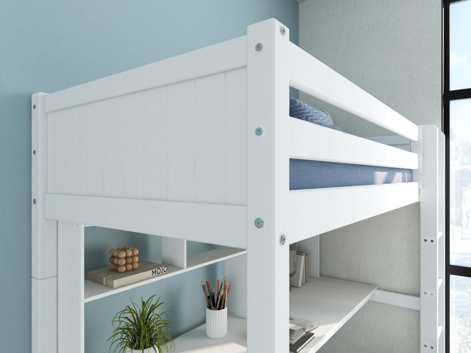 Vysoká postel Romantic je fantastickým řešením pro efektivní využití prostoru v pokoji vašeho teenagera. Pracovní deska stolu poskytne dostatek místa ke studiu, kreativním projektům či hraní her. Police dodají nezbytný úložný prostor.