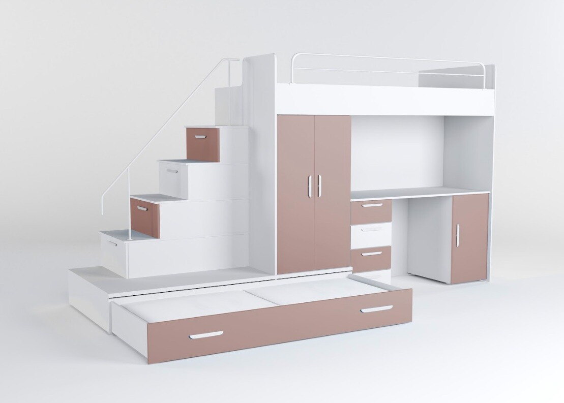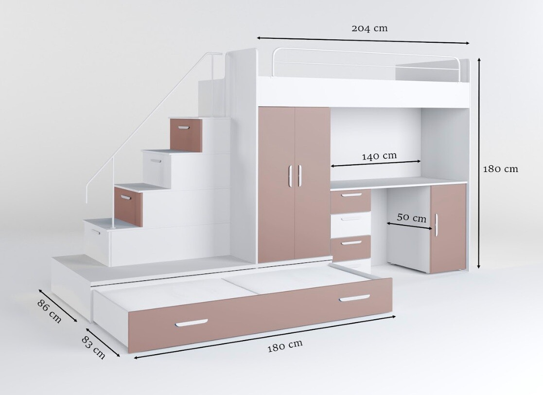 Naše postel se pyšní patentovaným provedením a stabilní konstrukcí, která zaručuje bezpečí pro vaše děti. Schody, které vedou k lůžku, jsou nejen stylové, ale také praktické, protože ukrývají spoustu úložného prostoru. Díky možnosti volby strany schodů (pravá nebo levá) se postel snadno přizpůsobí vašemu interiéru.