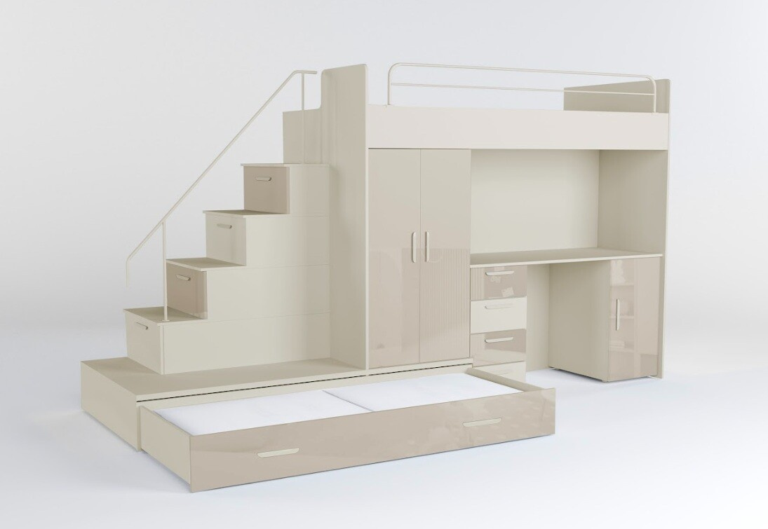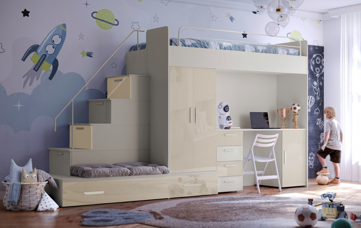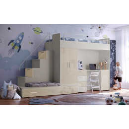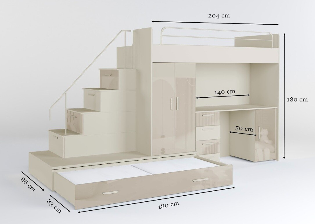 Tato postel je určená především pro osoby, které ocení moderní design, funkčnost a spoustu úložných prostorů. Patentované provedení a stabilní konstrukce postele Vám zaručuje bezpečí pro Vaše děti. Schody v sobě ukrývají spoustu úložného prostoru. Barevné provedení dvířek je v lesku a schůdky lze objednat jak na pravou tak i levou stranu (stranu schodů určujeme z čelního pohledu). Nosnost lůžka je 100 kg, nosnost schodu je 55 kg. Pod postelí se nachází psací stůl se šuplíky i šatní skříň včetně velkého výsuvného úložného šuplíku. K této posteli je možnost dokoupit další nábytek a utvořit tak krásný dětský pokoj. Uvedená úvodní fotografie je v Levém provedení.