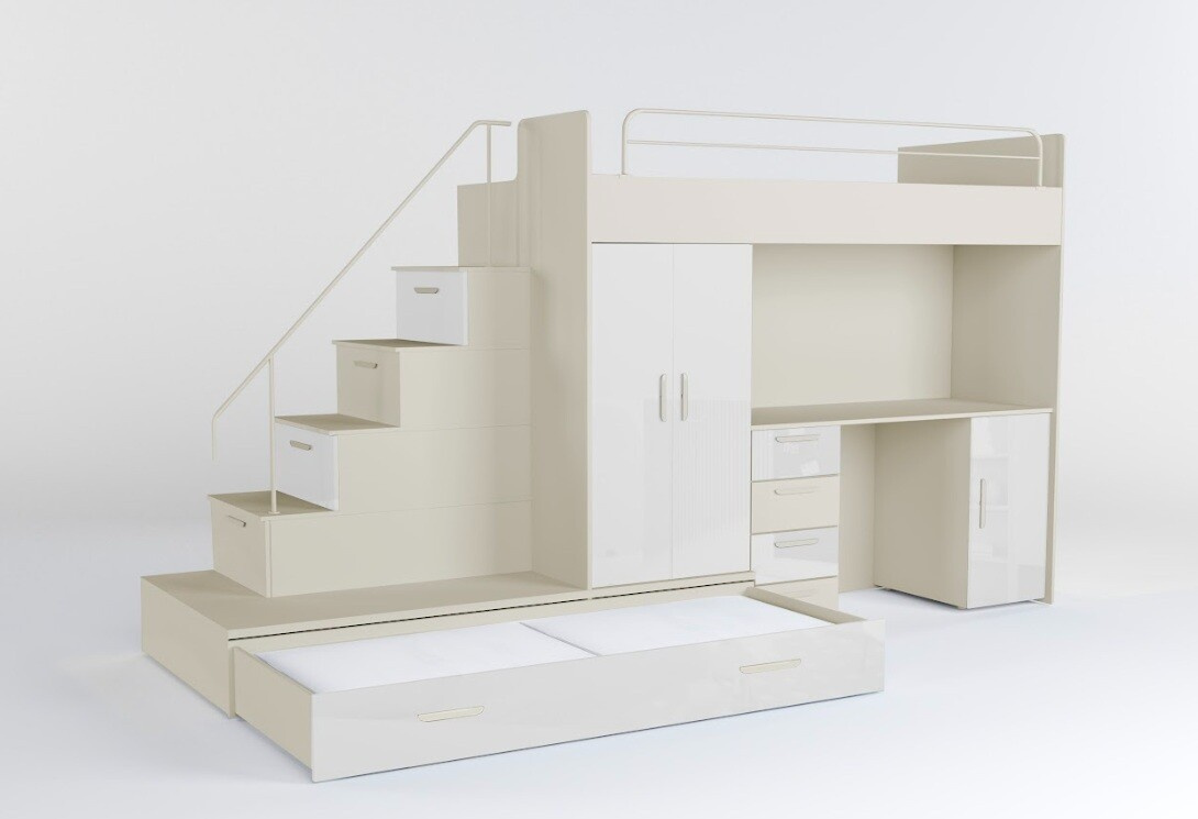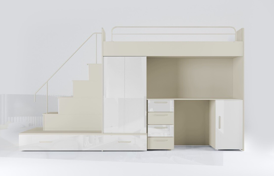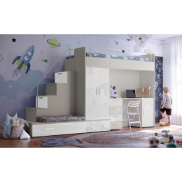 Tato postel je určená především pro osoby, které ocení moderní design, funkčnost a spoustu úložných prostorů. Patentované provedení a stabilní konstrukce postele Vám zaručuje bezpečí pro Vaše děti. Schody v sobě ukrývají spoustu úložného prostoru. Barevné provedení dvířek je v lesku a schůdky lze objednat jak na pravou tak i levou stranu (stranu schodů určujeme z čelního pohledu). Nosnost lůžka je 100 kg, nosnost schodu je 55 kg. Pod postelí se nachází psací stůl se šuplíky i šatní skříň včetně velkého výsuvného úložného šuplíku. K této posteli je možnost dokoupit další nábytek a utvořit tak krásný dětský pokoj. Uvedená úvodní fotografie je v Levém provedení.