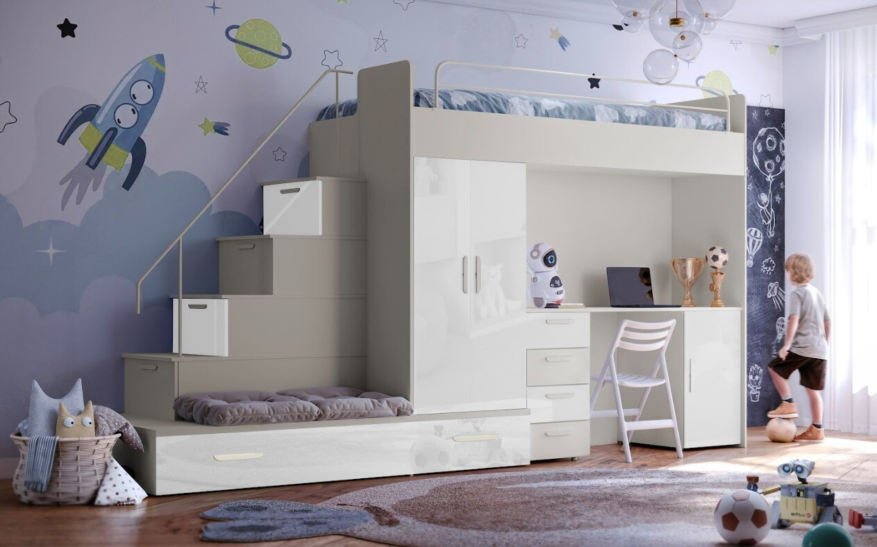 : Postel se schůdkami včetně polic, stolu a úložných prostorů