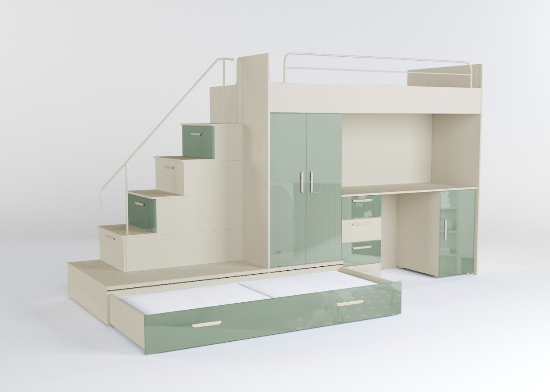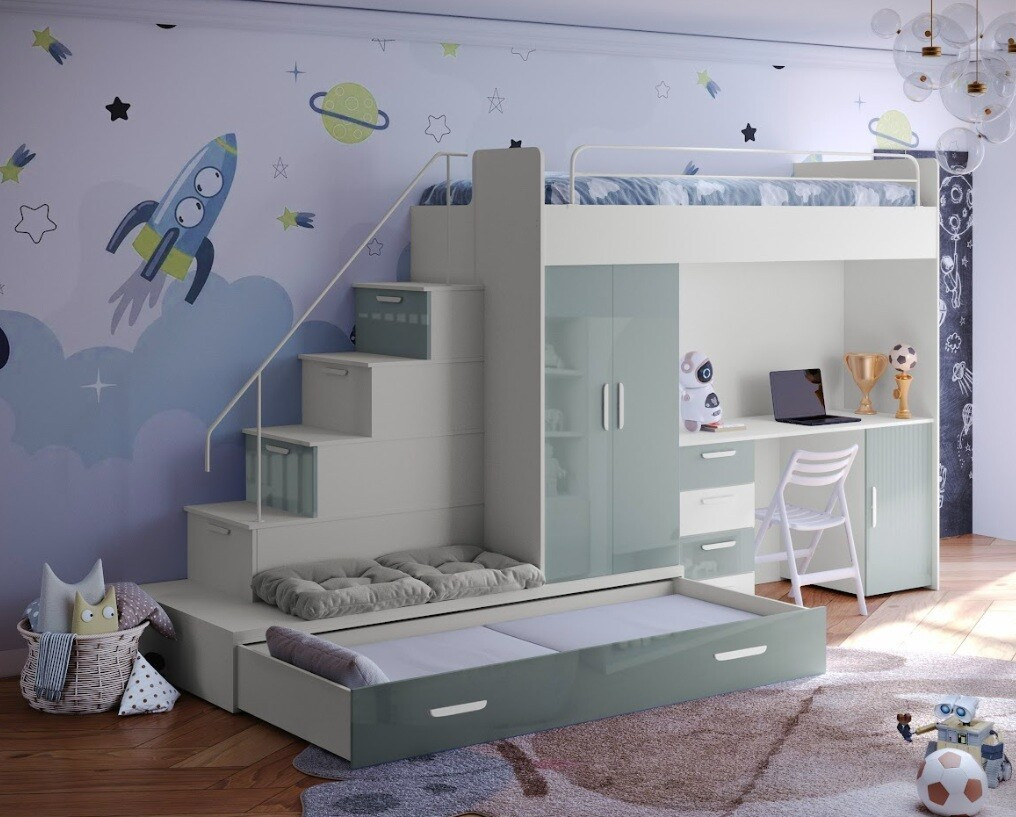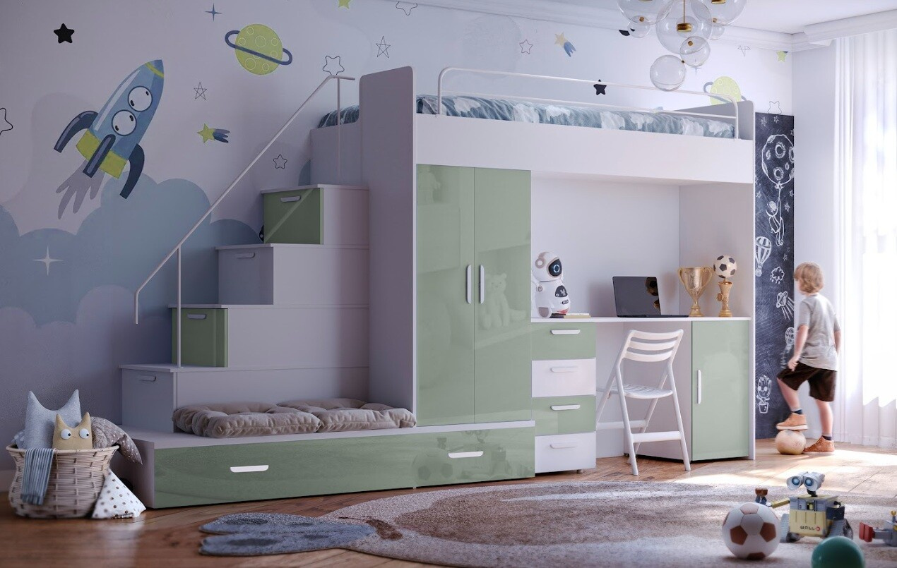 : Postel se schůdkami včetně polic, stolu a úložných prostorů