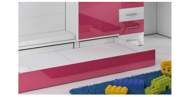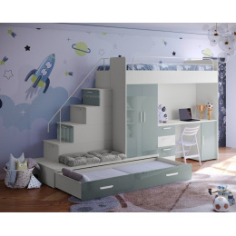 Tato postel je určená především pro osoby, které ocení moderní design, funkčnost a spoustu úložných prostorů. Patentované provedení a stabilní konstrukce postele Vám zaručuje bezpečí pro Vaše děti. Schody v sobě ukrývají spoustu úložného prostoru. Barevné provedení dvířek je v lesku a schůdky lze objednat jak na pravou tak i levou stranu (stranu schodů určujeme z čelního pohledu). Nosnost lůžka je 100 kg, nosnost schodu je 55 kg. Pod postelí se nachází psací stůl se šuplíky i šatní skříň včetně velkého výsuvného úložného šuplíku. K této posteli je možnost dokoupit další nábytek a utvořit tak krásný dětský pokoj. Uvedená úvodní fotografie je v Levém provedení.