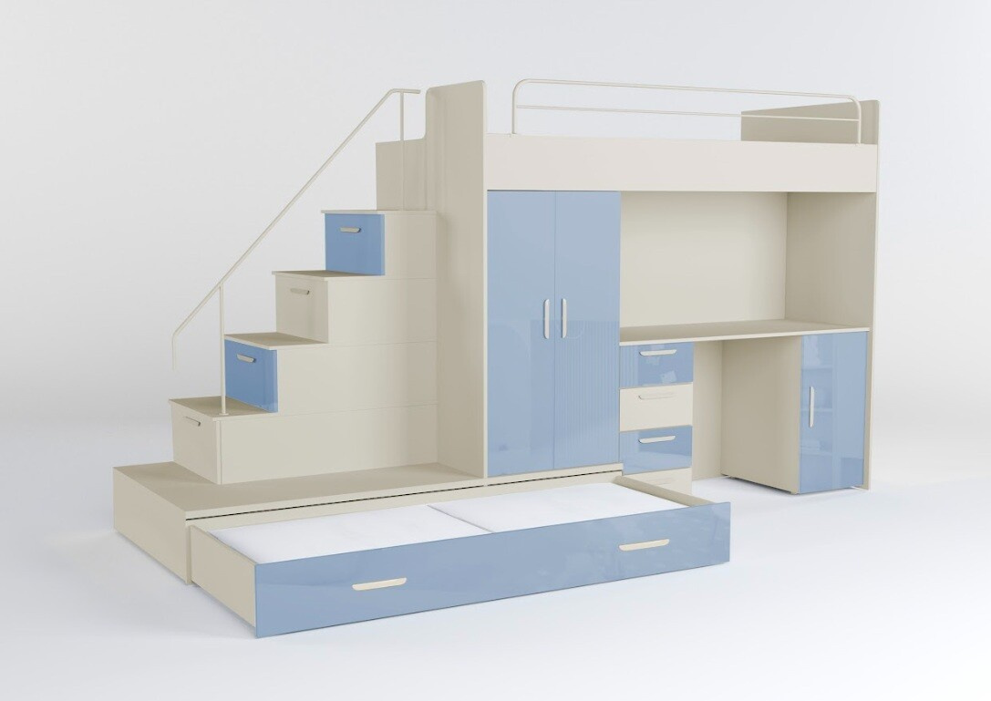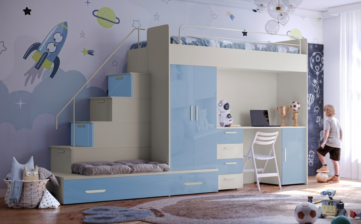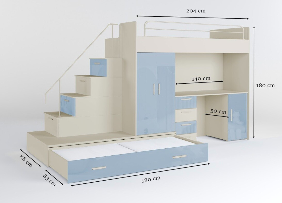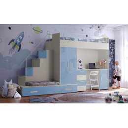 Tato postel je určená především pro osoby, které ocení moderní design, funkčnost a spoustu úložných prostorů. Patentované provedení a stabilní konstrukce postele Vám zaručuje bezpečí pro Vaše děti. Schody v sobě ukrývají spoustu úložného prostoru. Barevné provedení dvířek je v lesku a schůdky lze objednat jak na pravou tak i levou stranu (stranu schodů určujeme z čelního pohledu). Nosnost lůžka je 100 kg, nosnost schodu je 55 kg. Pod postelí se nachází psací stůl se šuplíky i šatní skříň včetně velkého výsuvného úložného šuplíku. K této posteli je možnost dokoupit další nábytek a utvořit tak krásný dětský pokoj. Uvedená úvodní fotografie je v Levém provedení.