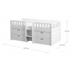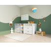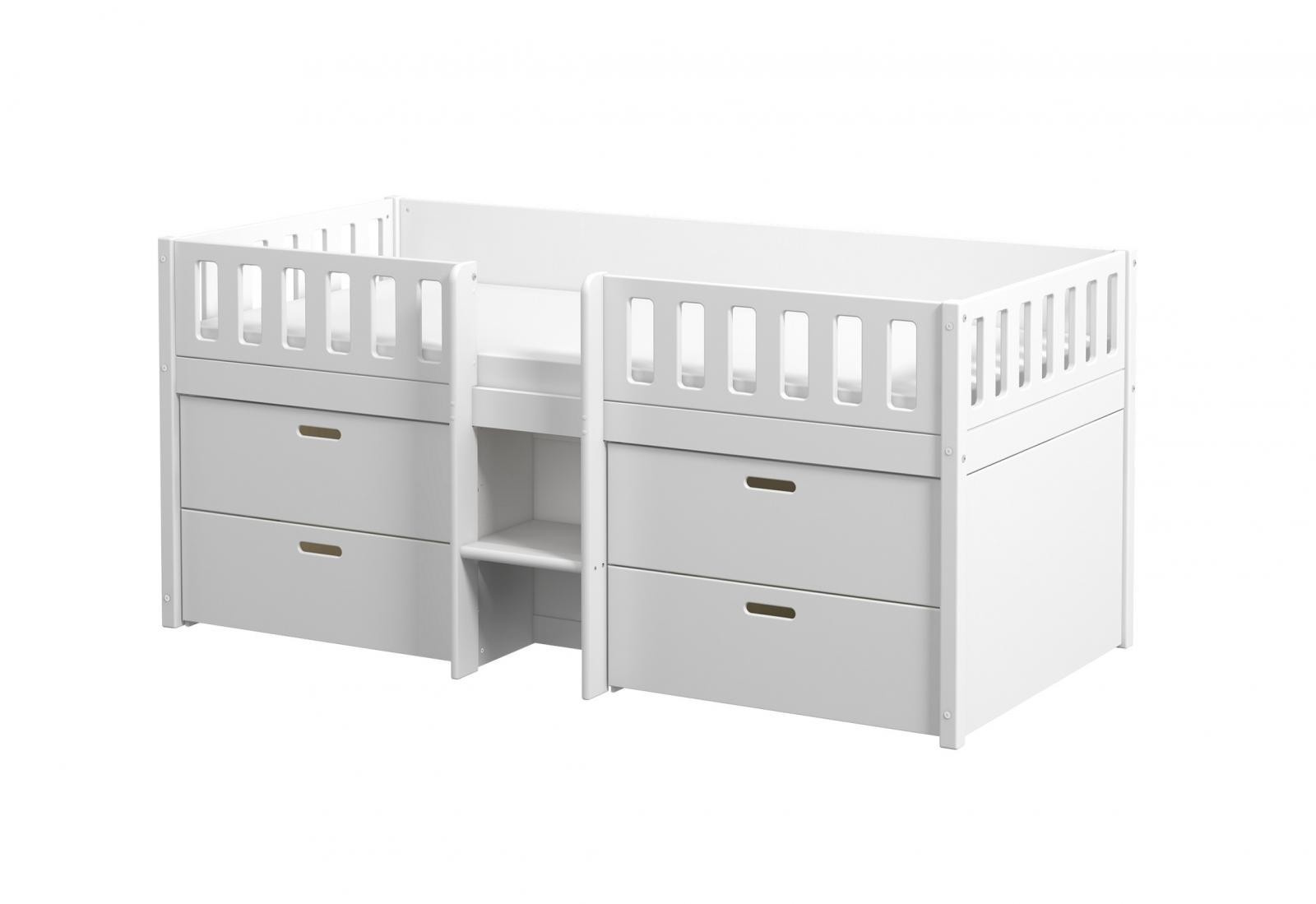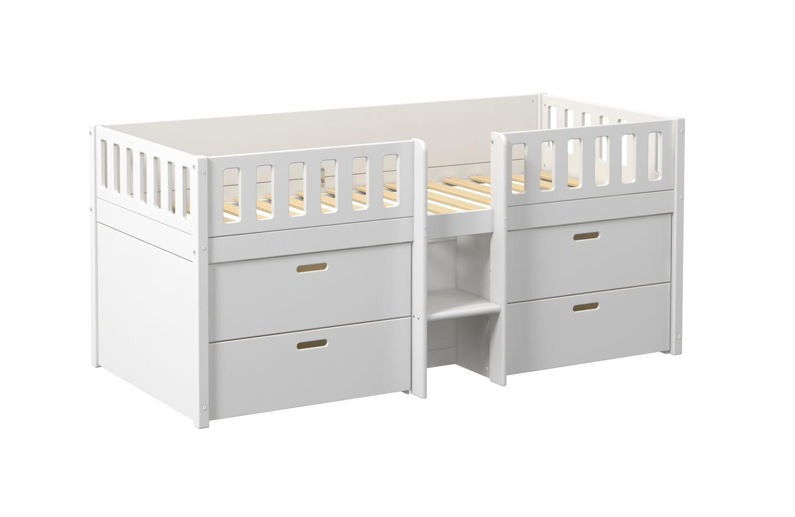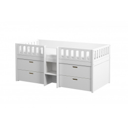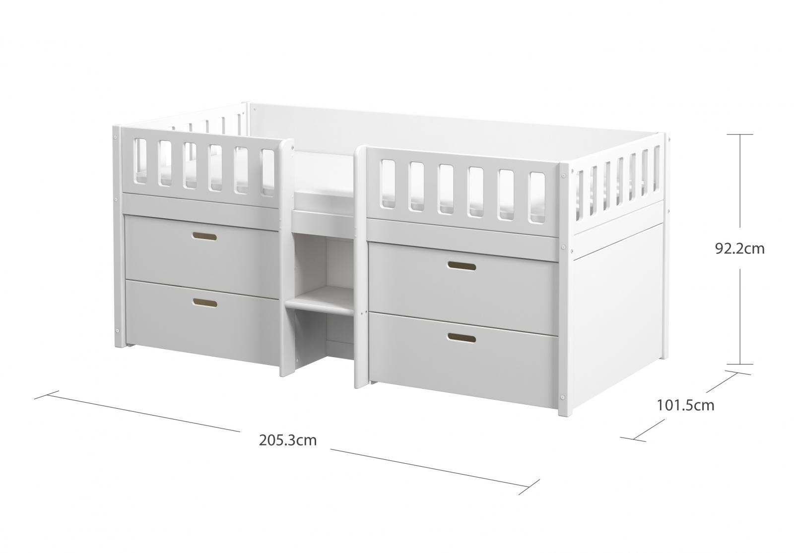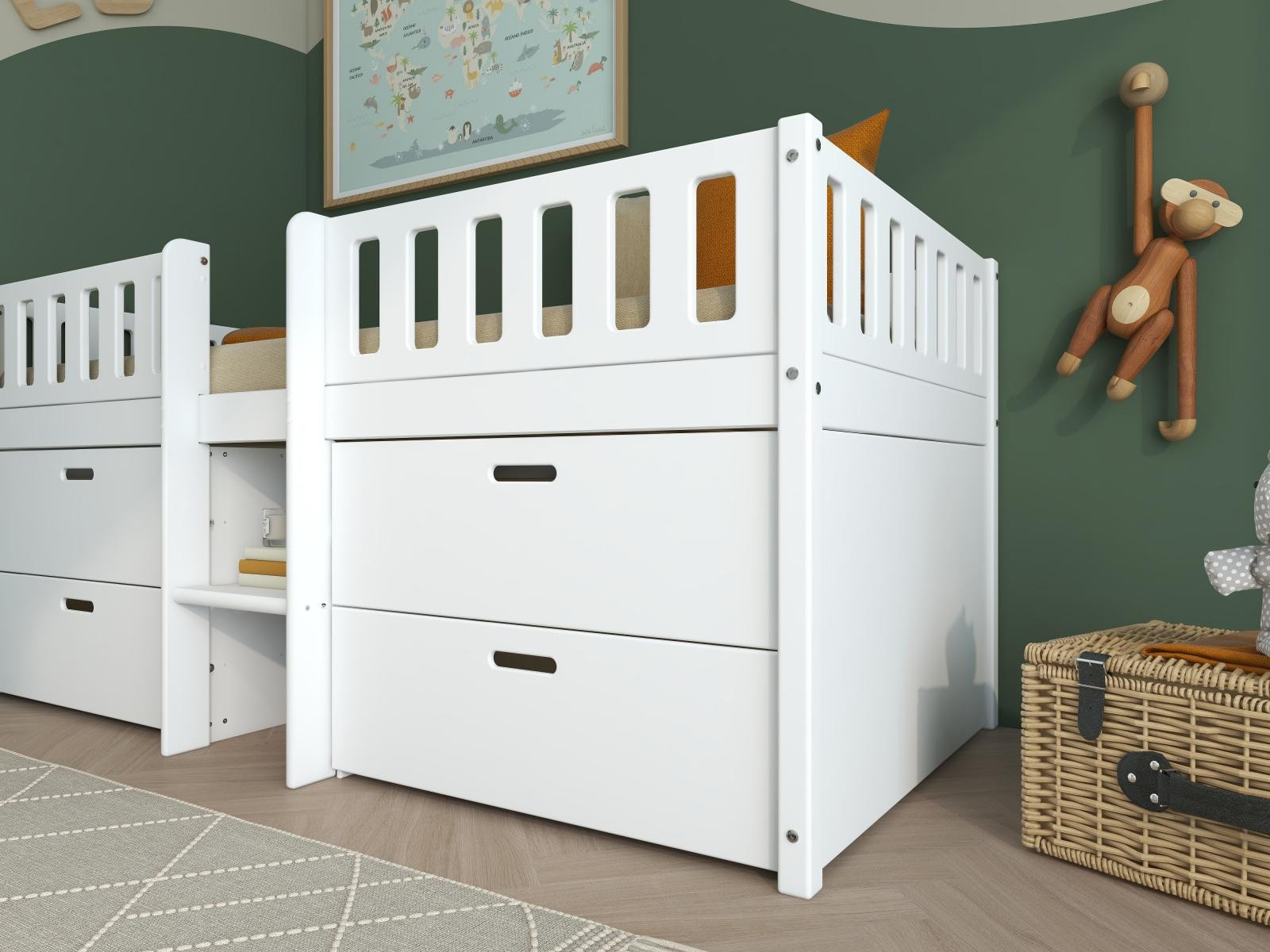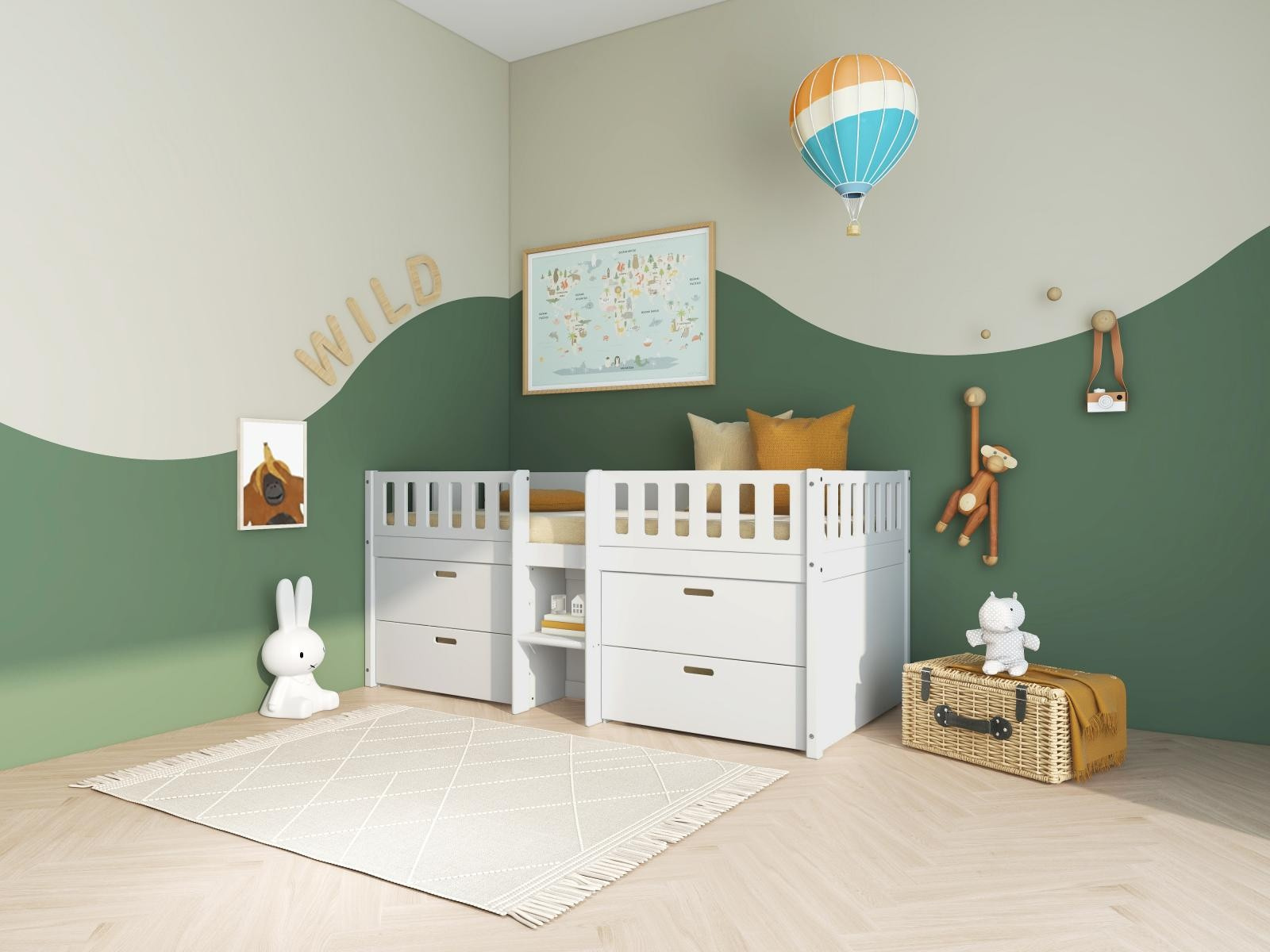 Vyvýšená postel se 4 zásuvkami a výškou 92 cm je dokonalým přechodem z dětské postele. Postel poskytuje útulné a bezpečné místo na spaní, zatímco zásuvky a police pod ní spoustu prostoru pro uložení hraček a oblečení. Přední bezpečnostní lištu lze později odstranit.