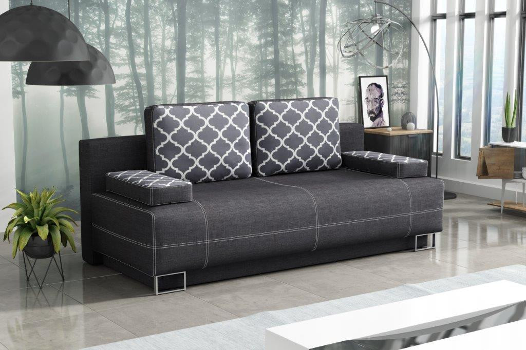 Pohovka Timmy zaujme především svým nápaditým designem. Hodí se do každého moderního prostoru a skvěle ho doplní. Pohovka je rozkládací a samozřejmostí je i praktický úložný prostor. Výplň sedáku tvoří kombinace pružin bonell s kvalitní PUR pěnou. Jednoduchým rozložením vznikne lůžko k občasnému přespání. Pohovku nabízíme v několika atraktivních vzorech. V ceně pohovky jsou dva velké opěrné polštáře a dva malé polštáře na bocích pohovky, které plní funkci područí. Všechny polštáře jsou odnímatelné. Ostatní vyobrazené dekorace nejsou v ceně.