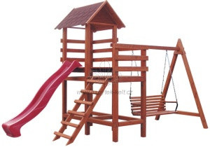 Zahradní dětské dřevěné hřiště. Dodávame v odstínu Teak. Montáž je na vyžádání. Vhodné pro děti od 5 let. Cena včetně klouzačky 3 m.