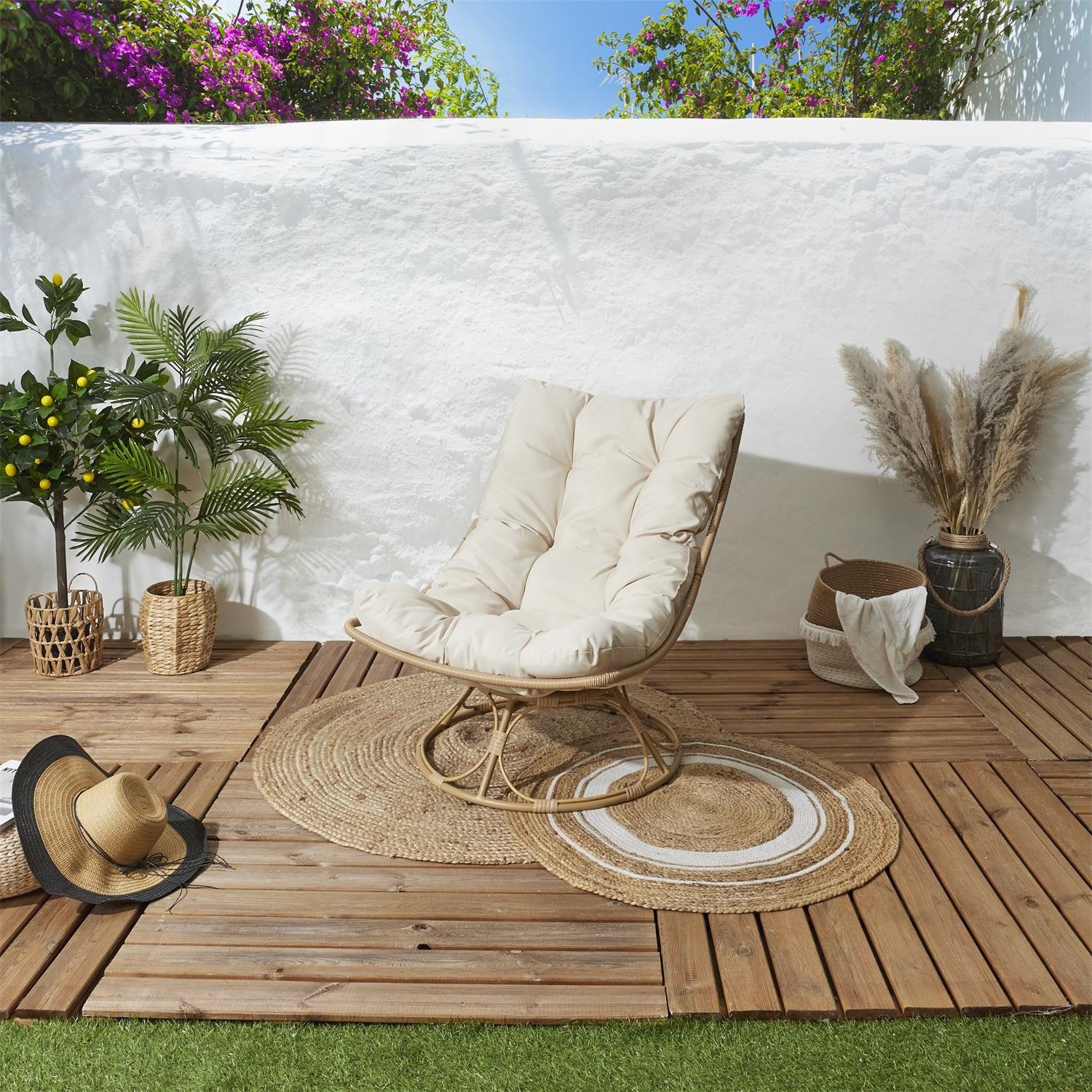 Komfortní křeslo do zahrady nebo na terasu. Vyrobený z odolných materiálů, odolný vůči UV záření a vodě. Ocelová konstrukce s epoxidovou ochranou. Snadná montáž – návod v balení. Hmotnost produktu: 11,47 kg Výška sedáku: 35 cm Maximální zatížení: 110 kg Produkt určený pro venkovní použití: Ano Rám: Kov – Železo (40%) Sedák a opěradlo: Tkanina – Polyester (40%) Další prvky: Plast – PE (polyethylen) (20%) Odolnost vůči UV záření: Ano Voděodolný povrch: Ano Epoxidová ochrana: Ano Možnost stohování: Ne Montážní návod: V balení