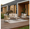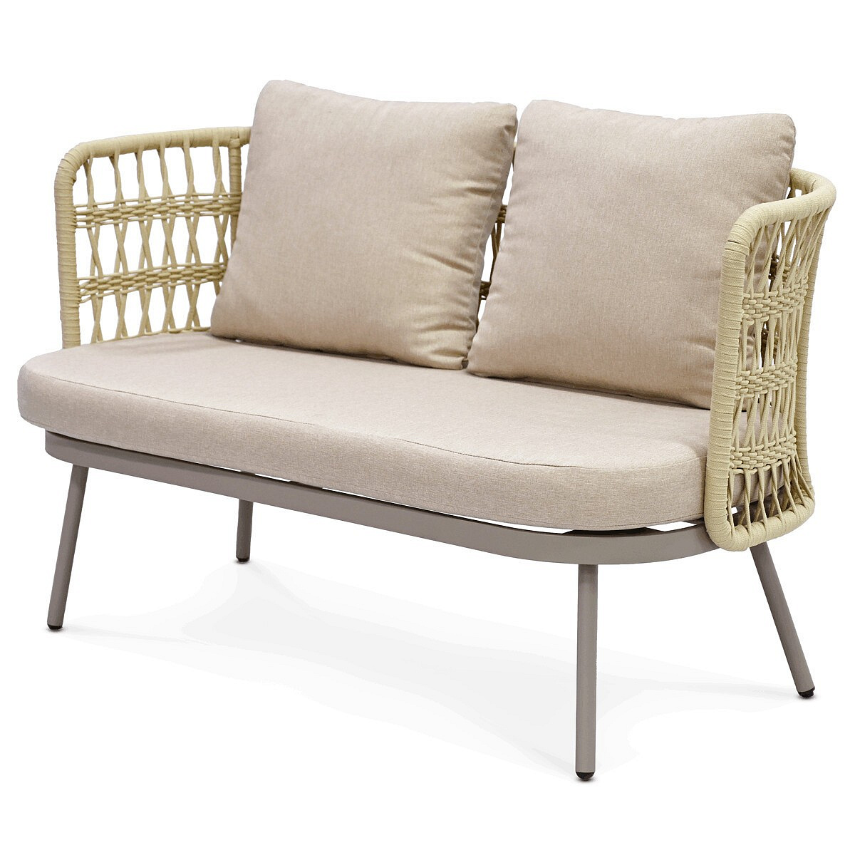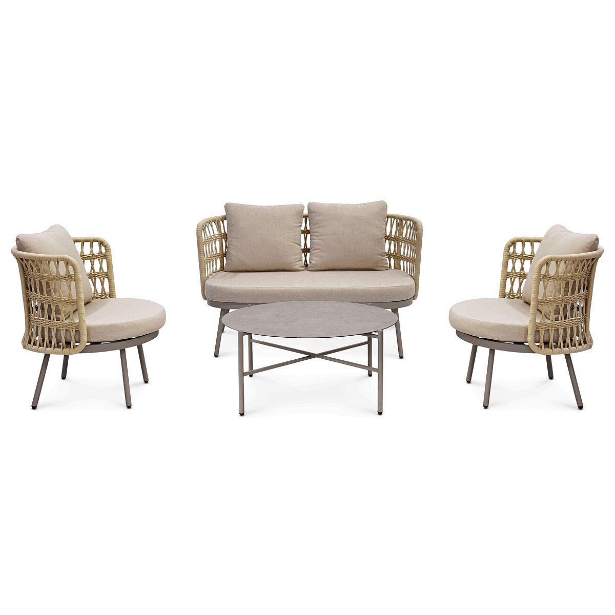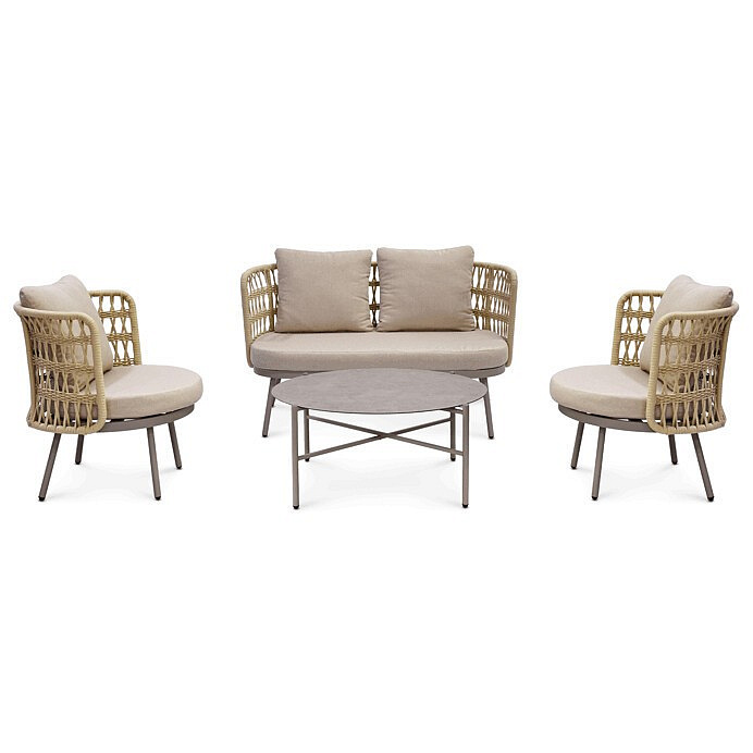 Zahradní set 1+3 v béžovém provedení kombinuje pevnou kovovou desku stolu s pohodlnými křesly a lavicí potaženými látkou v přírodních odstínech. Pevná kovová konstrukce stolové desky zajišťuje stabilitu a odolnost vůči povětrnostním vlivům, zatímco lehká kovová podnož doplňuje vzdušný design. Sedací plochy jsou vybaveny měkkými polštáři s látkovým potahem, který je snadno udržovatelný a vhodný pro venkovní použití. Otevřená struktura opěradel vytváří vzdušný vizuální efekt a přispívá k celkové pohodě při posezení. Nadčasový design zahradního setu umožňuje jeho snadné začlenění do různých venkovních prostorů.